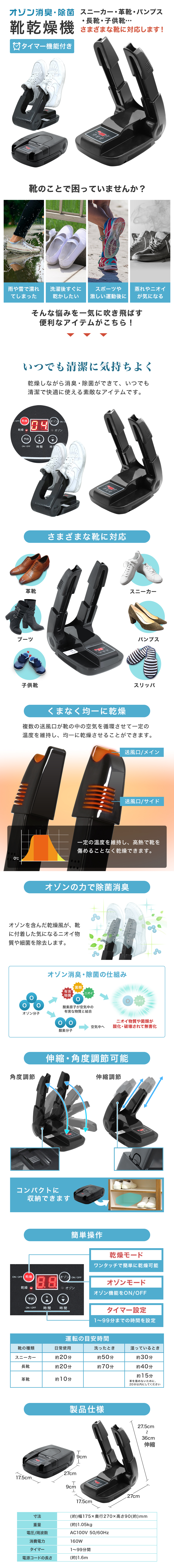 | 乾燥しながら除菌・消臭ができるくつ乾燥機! 「雨で濡れてしまった」「洗濯後すぐ乾かしたい」「蒸れや臭いが気になる」… そんなお悩みはこの商品を使えば一気に解決できます! アームは角度調節・伸縮調節可能なので スニーカー、革靴、ブーツ、パンプス、子供靴、スリッパ等、さまざまな靴に対応可能! 送風口を複数配置することで、靴の中の空気を循環させて 一定の温度を維持し、高熱で靴を傷めることなく均一に乾燥できます! オゾンを含んだ乾燥風で除菌・消臭! 靴に付着した気になる臭いの基となる物質や細菌を除去します。 操作は簡単!折りたたみ式で収納時もコンパクトに! 大事な靴をお家で簡単にお手入しましょう♪ ■商品コード:FTD001BK ■商品仕様 サイズ(約):幅17.5cm×奥行27cm×高さ9cm 重さ(約):1.05kg 電圧/周波数:AC100V 50/60Hz 消費電力:160W コードの長さ(約):1.6m サイズ(約):幅17.5cm×奥行27cm×高さ9cm 重さ(約):1.05kg 電圧/周波数:AC100V 50/60Hz 消費電力:160W コードの長さ(約):1.6m ■注意事項 ・商品は、モニターによって色合いが異なって見える場合があります。 ・仕様・デザインは改良のため予告なく変更することがあります。 ■保障期間 1年間 【もちろん新品未使用品です】 |