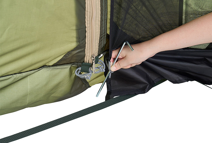 PANEL SYSTEMのフックや本体のジッパーなどに取り付けて ペグダウンすれば装着できます。