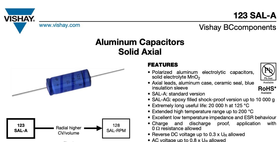 Philips, Vishay BCにはそっくりな外観の昔ながらの青いコンデンサもありますが(あちらは123ではありません)、本品123 SAL-A(Solid Aluminum, Axial)は新世代の固体電解コンデンサです。