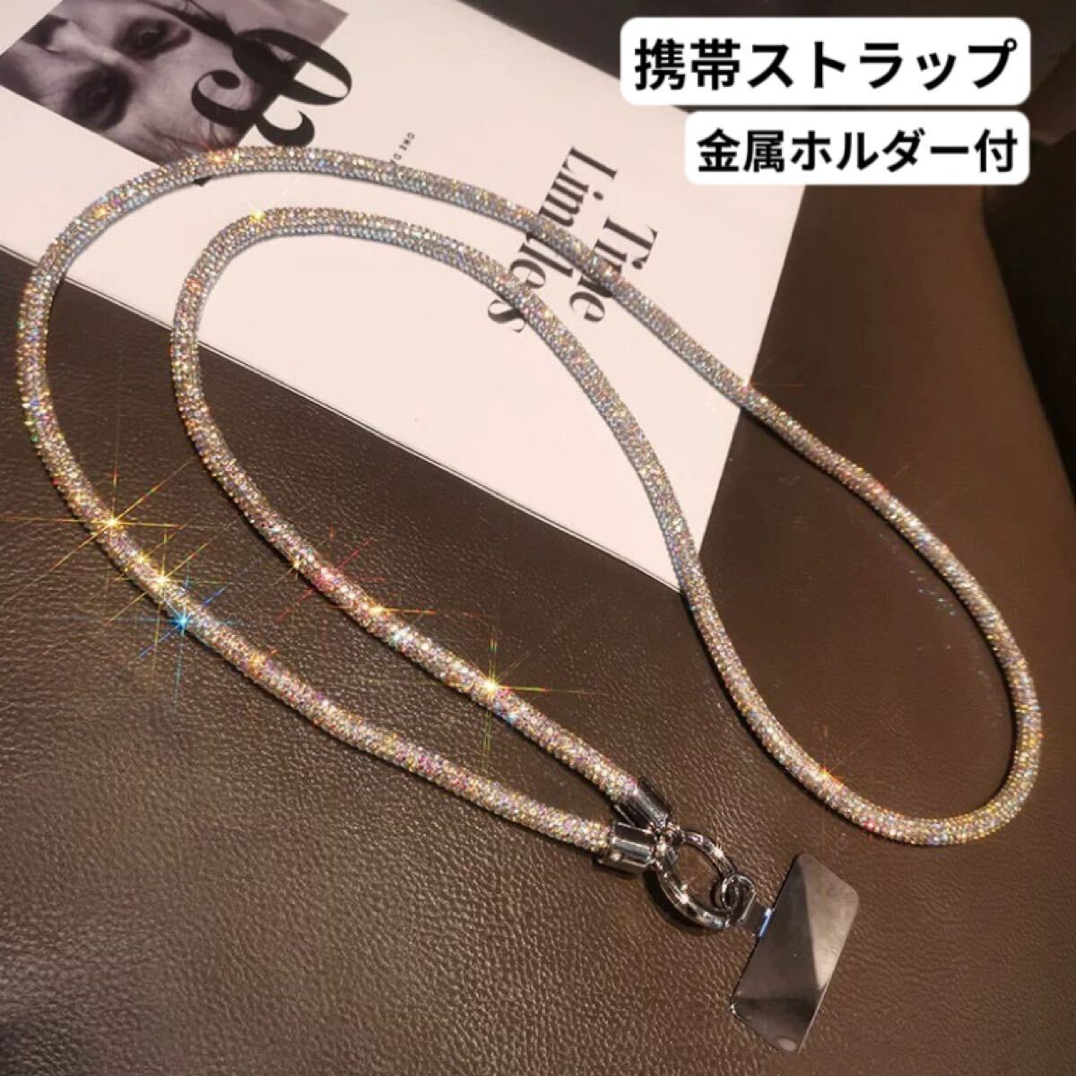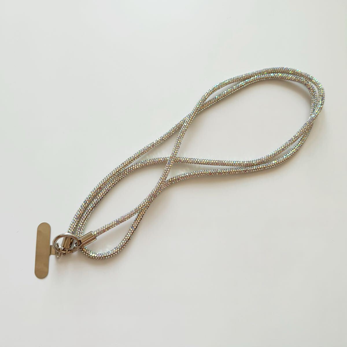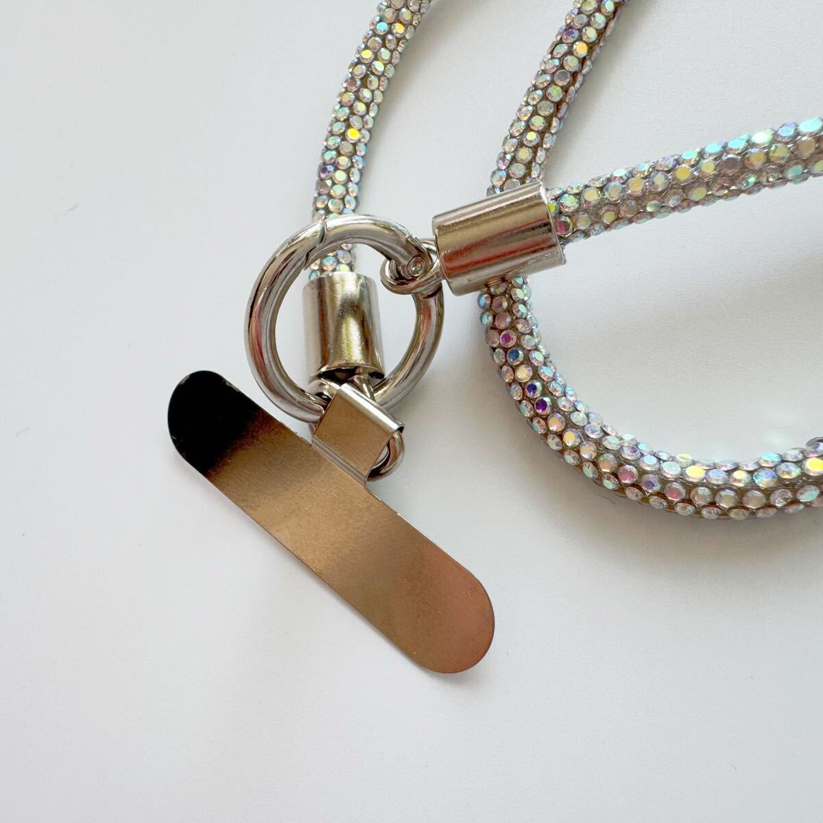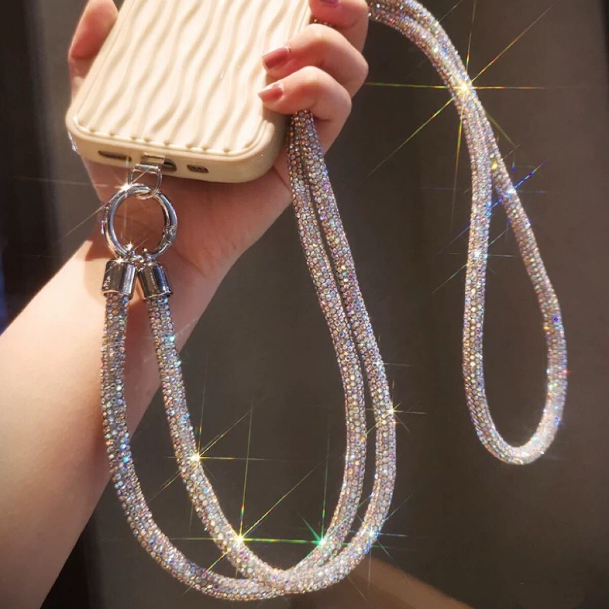 光が当たると美しく輝き、シンプルなコーディネートにもよく映えます。長さは肩掛け・斜め掛けにちょうどよく、外出や旅行、ライブやフェスなど様々なシーンで活躍します。スマホをしっかり支える丈夫な作りで、ホルダー部分には金属素材を使用しています。見た目だけでなく、耐久性にもこだわりました。ぜひお試しください。