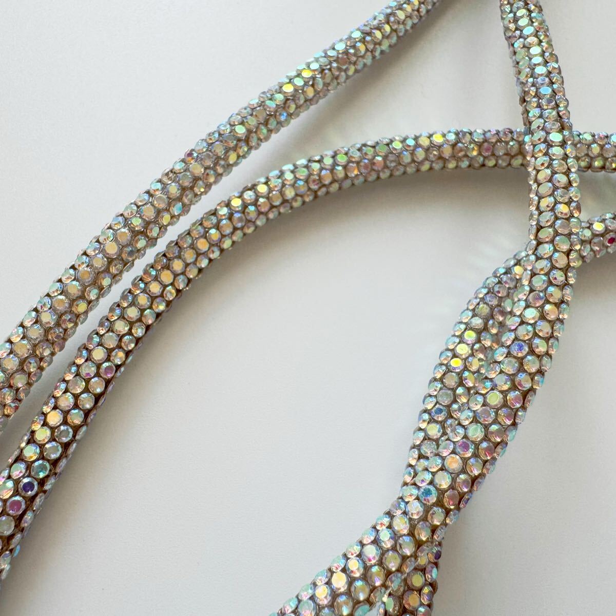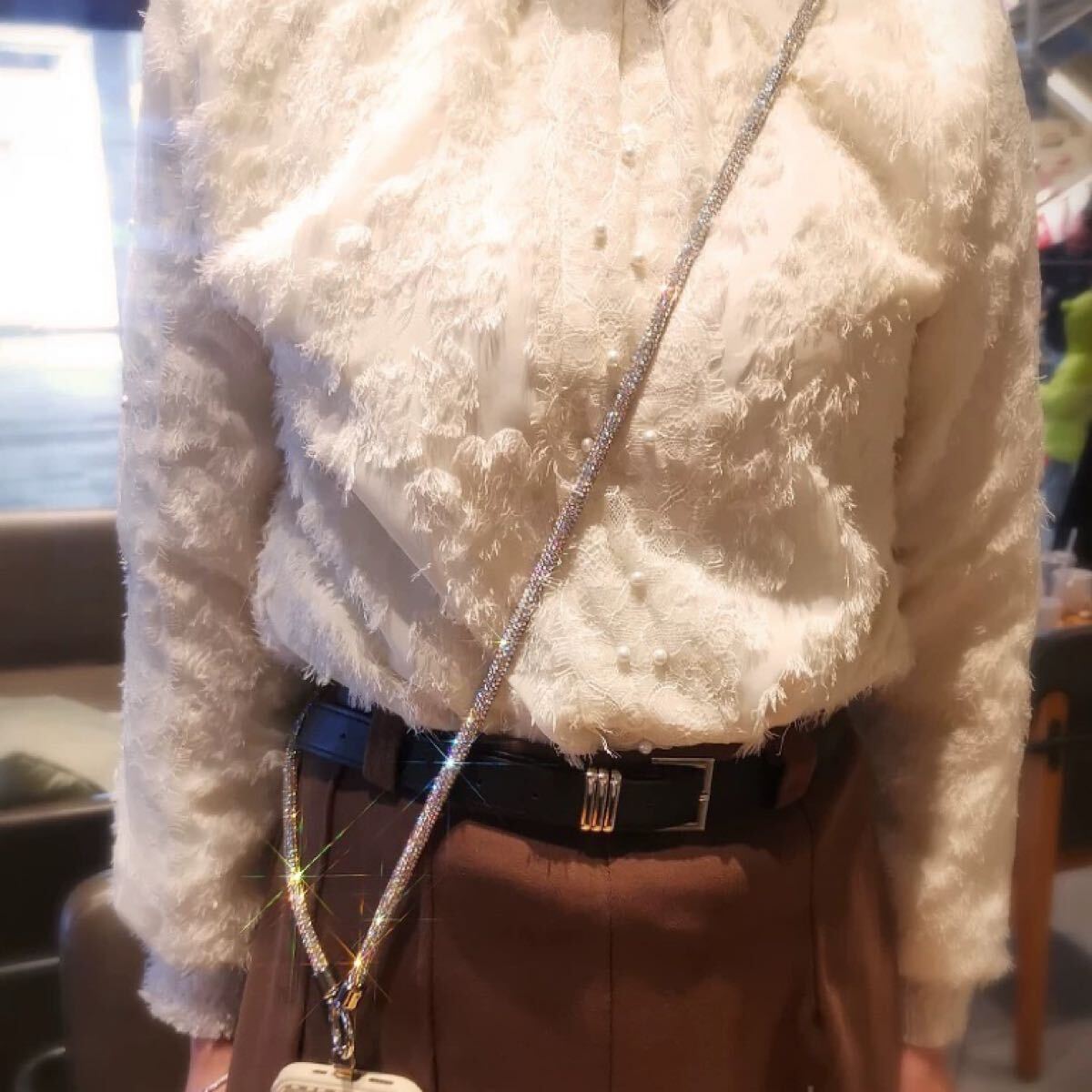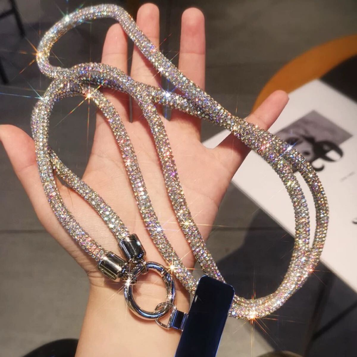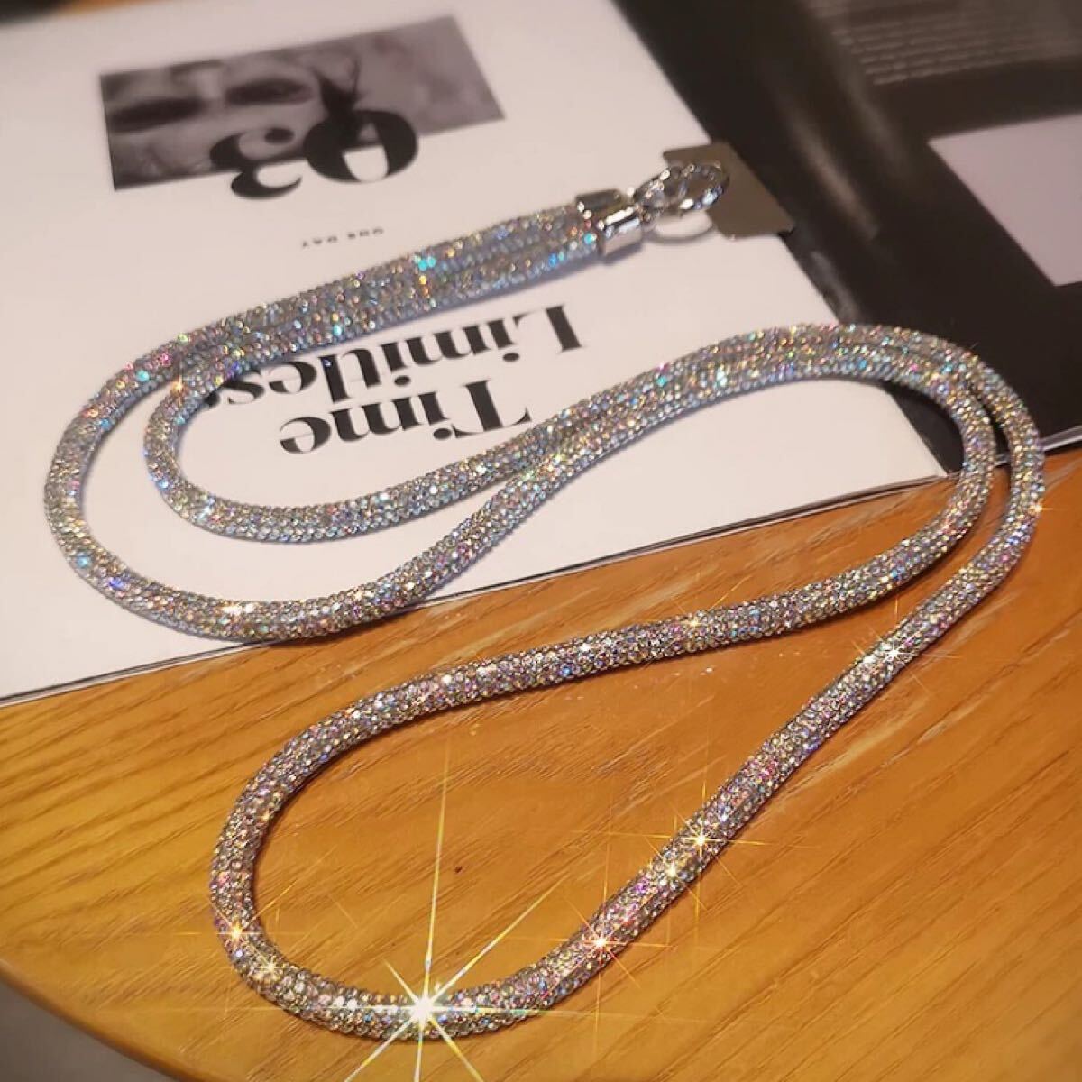 光が当たると美しく輝き、シンプルなコーディネートにもよく映えます。長さは肩掛け・斜め掛けにちょうどよく、外出や旅行、ライブやフェスなど様々なシーンで活躍します。スマホをしっかり支える丈夫な作りで、ホルダー部分には金属素材を使用しています。見た目だけでなく、耐久性にもこだわりました。ぜひお試しください。