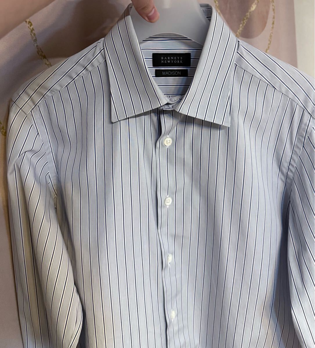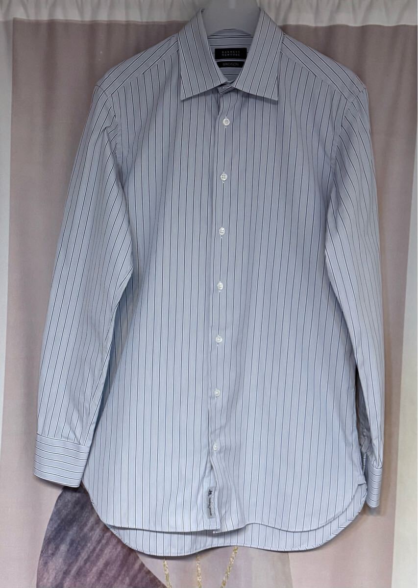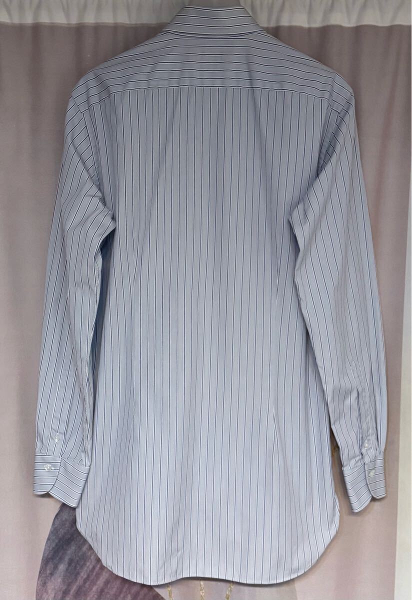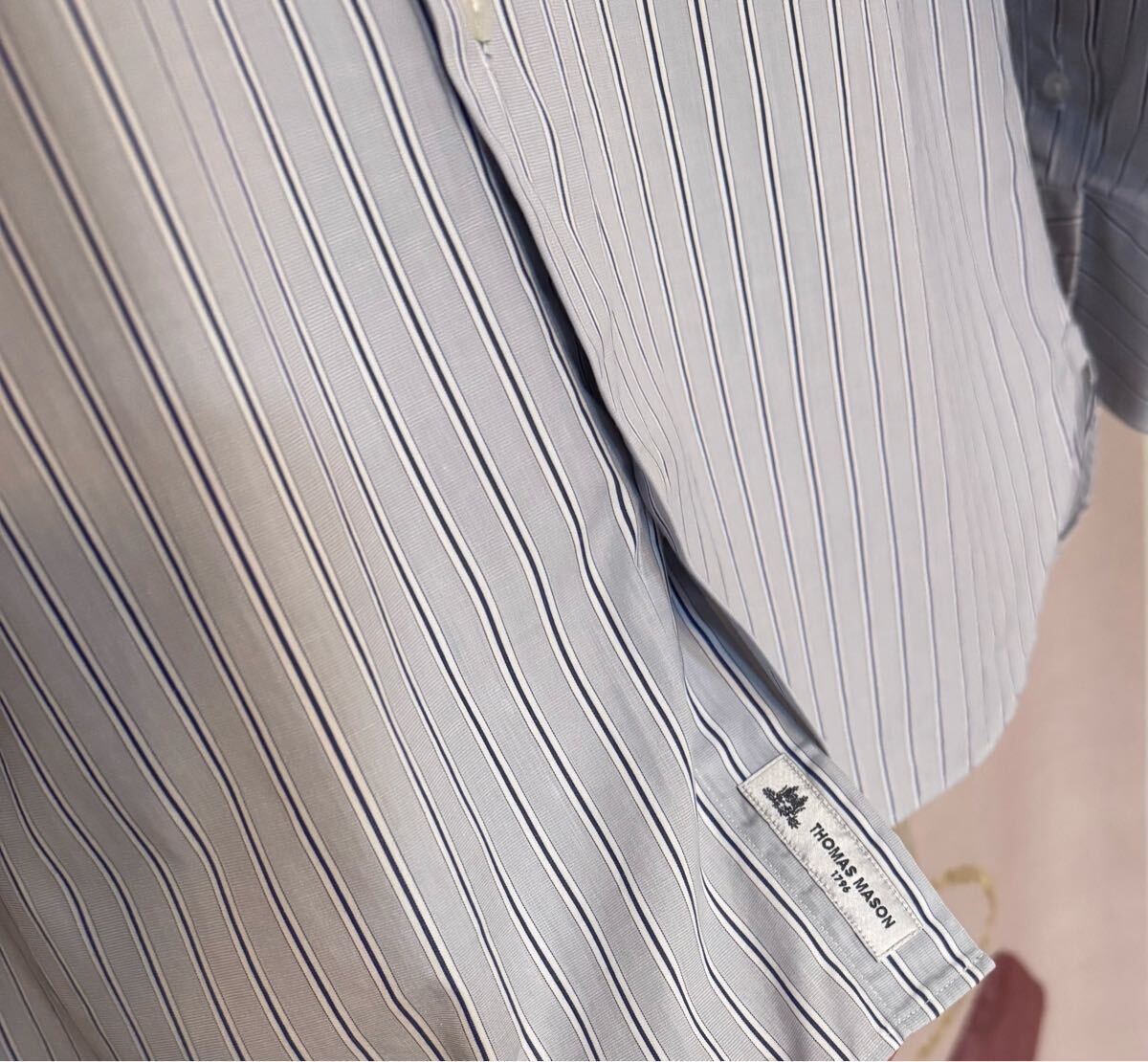 ・上質なトーマスメイソンのコットン生地を100%使用したパープルストライプにグレーのデザインがお洒落なドレスシャツとなります。