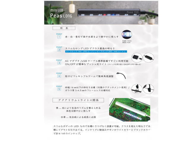 | 商品名:ミニLEDピースロング200 ホワイト 赤・白・青灯でより鮮やかに照らすロングスティックタイプ クラス最高の明るさ ・赤・白・青灯で魚や水草をより鮮やかに照らす ・スリムロングLEDでクラス最高の明るさ ・ACアダプター/USBケーブル標準装備ですぐ利用可能 ON/OFFが簡単なプッシュ式ライト (スイッチを押す度にON/OFFが切り替わる) ・防サビフレキシブルアームで簡単角度調整 ・枠幅16mm以下の枠付き水槽(付属のアタッチメント使用) ガラス厚3.4.5mmのフレームレス水槽対応 ■アクアリウムとライトの関係 魚:光により生活のリズムを整えられる体色を鮮やかに照らす 水草:光合成による成長に必須 ■商品仕様 本体カラー:ホワイト ボディ長:約20cm 電源コード長:約100cm フレキシブルアーム長:約15.5cm 定格消費電力:11W 全光速:440ルーメン 適合水槽:幅45cm以下 付属品:ACアダプター/USBケーブル/枠付き水槽アタッチメント フレームレス水槽:ガラス厚3.4.5mmの水槽 枠付き水槽:枠幅16mm以下 LED照明以外の水槽・水草等は価格に含まれておりません。 ミニLEDピースロング200ホワイト1台のお届けです。 |
