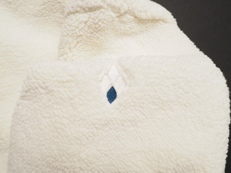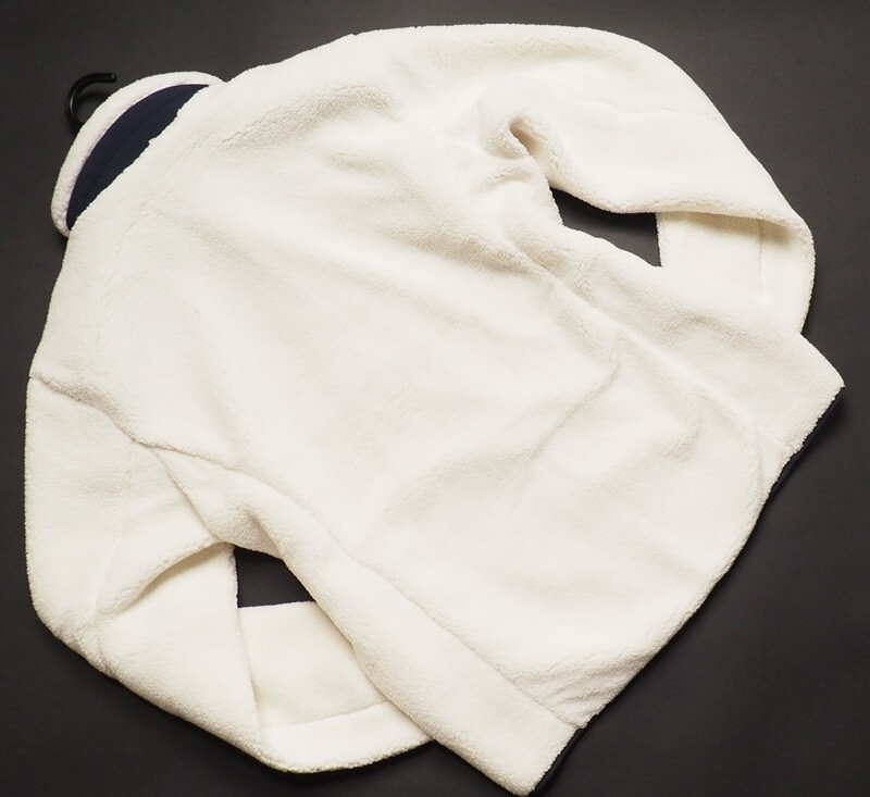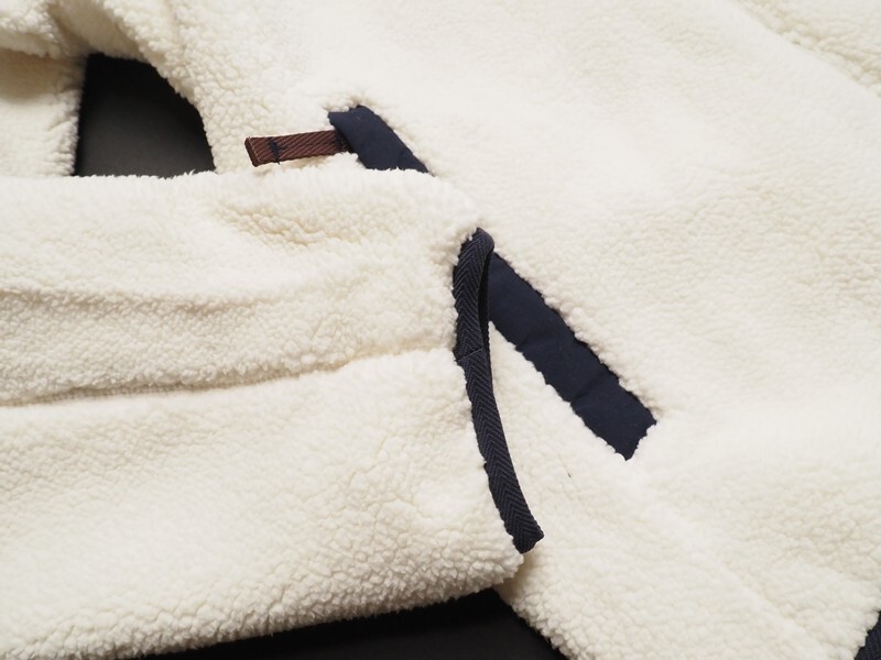 もこもこ感のある柔らかく厚手の質感のフリースになります。首回りとポケットをナイロンタフタ生地で切り替えています。