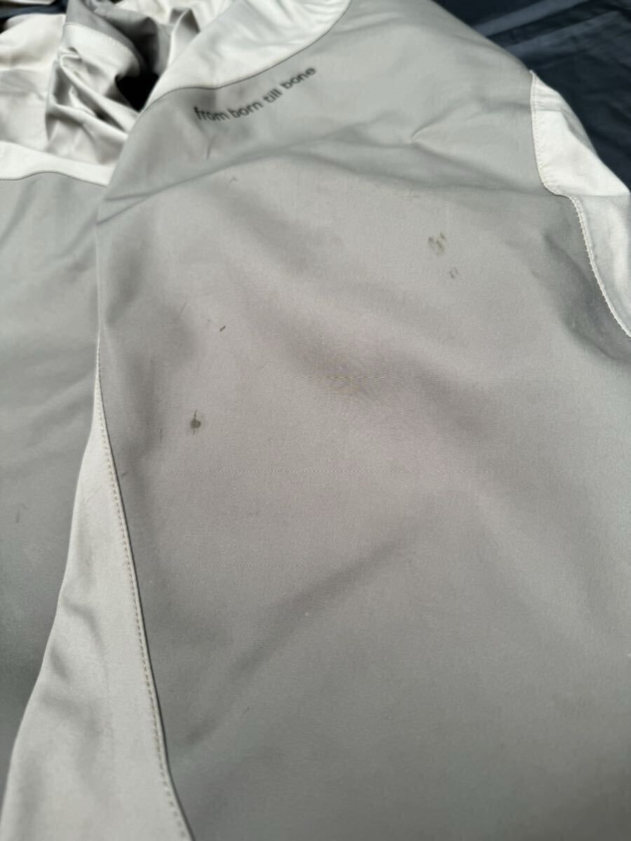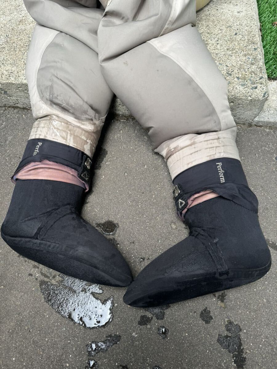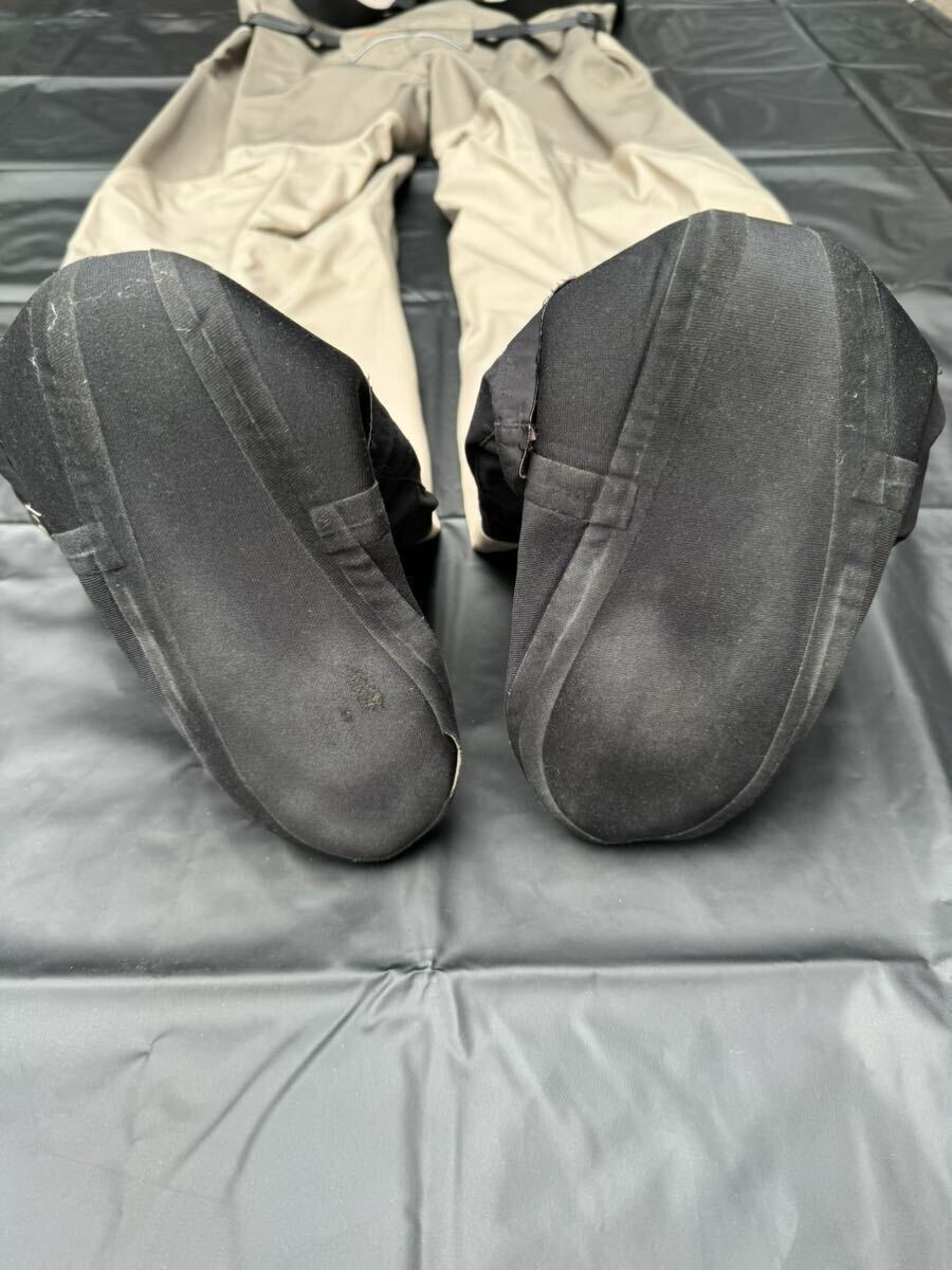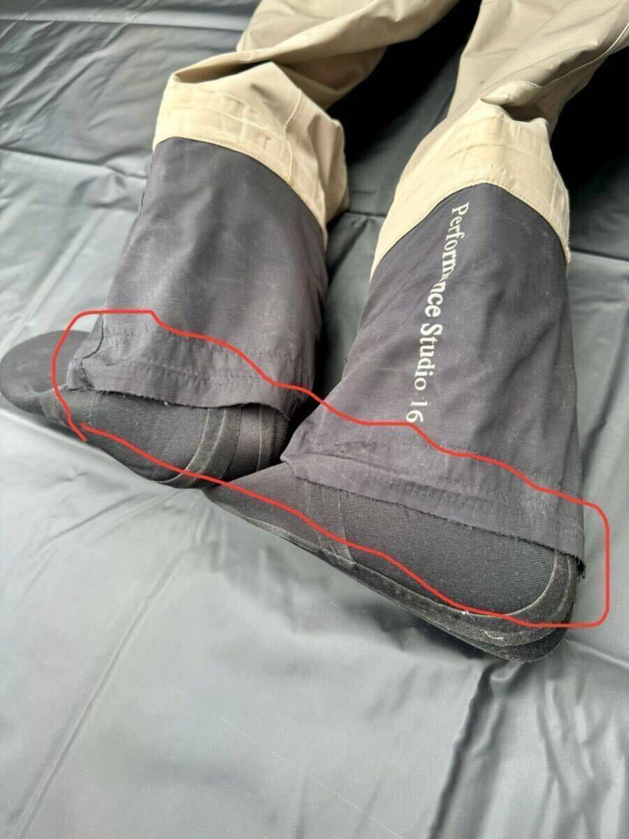 10枚目の写真は、水を入れて漏れを確認した写真です、ウェーダー本体と足ネオプレーン繋ぎ目からにじみあり、また足ネオプレーン張り合わせ部分からにじみ有ります。