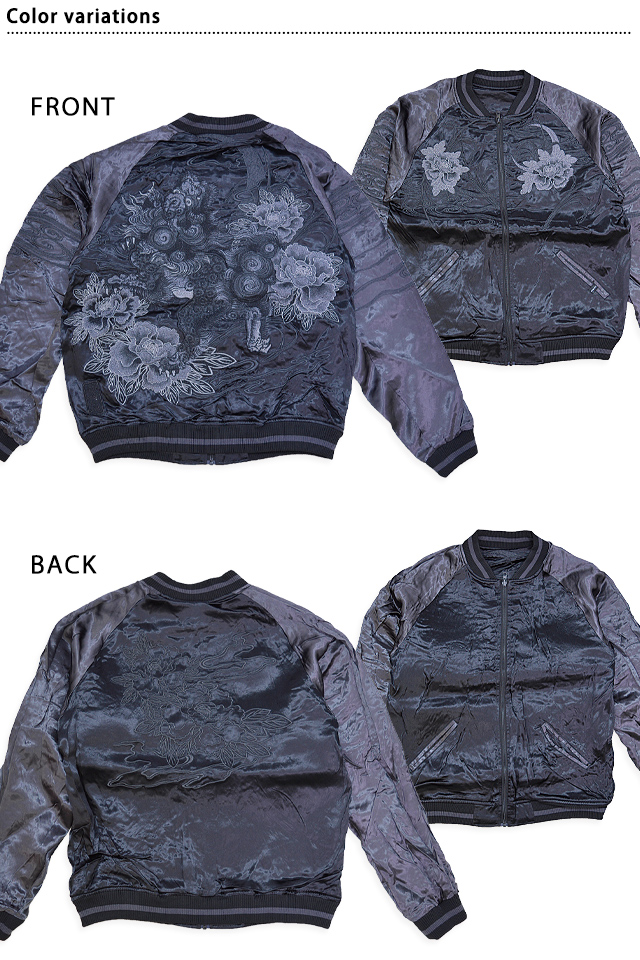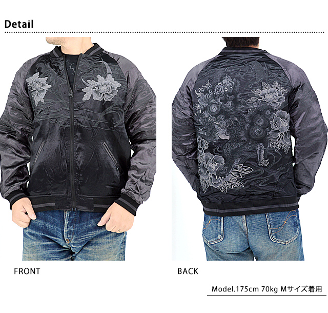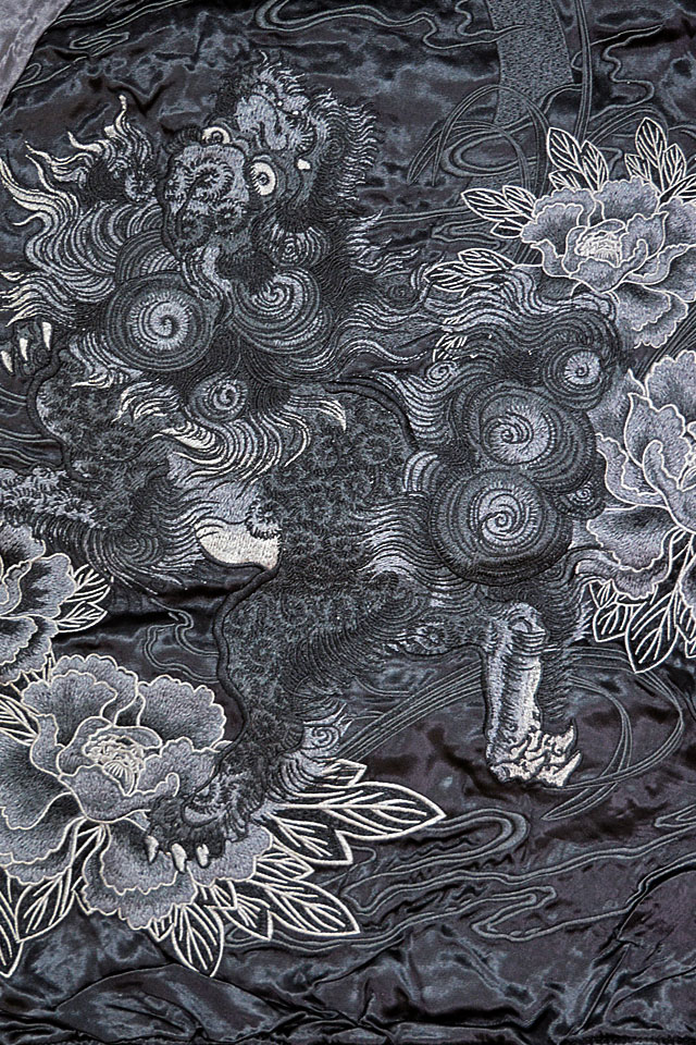 絡繰魂さんから「漆 唐獅子牡丹リバーシブルスカジャン(243085)」のご紹介です。 【黒】が秘める可能性。その潜在能力を存分に解放した新レーベルが初登場! 今回、モチーフの主役に採用されたのは【唐獅子】柄。 背景にはお馴染みの牡丹を組み合わせ、奥行きのある図案に仕上げられています。 表面はしっかり柄の入ったスカジャンですが、対象的に裏面はシンプルに仕上げ、メリハリを付けました。 ボディーにはレーヨンサテンを使用し、ドレープや陰影がくっきりと現れています。 | ||||||||||||||||||||