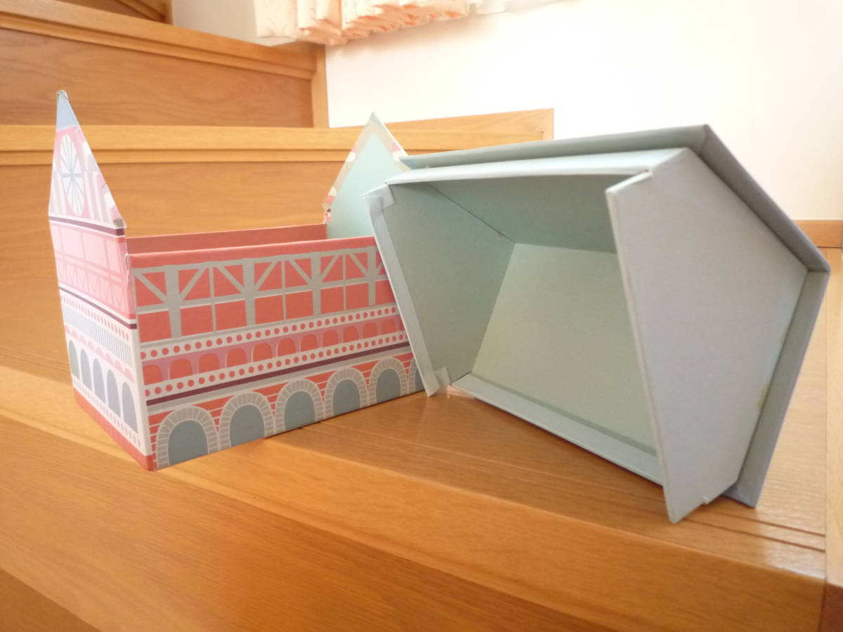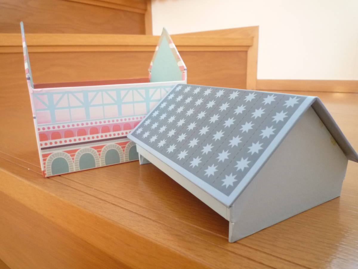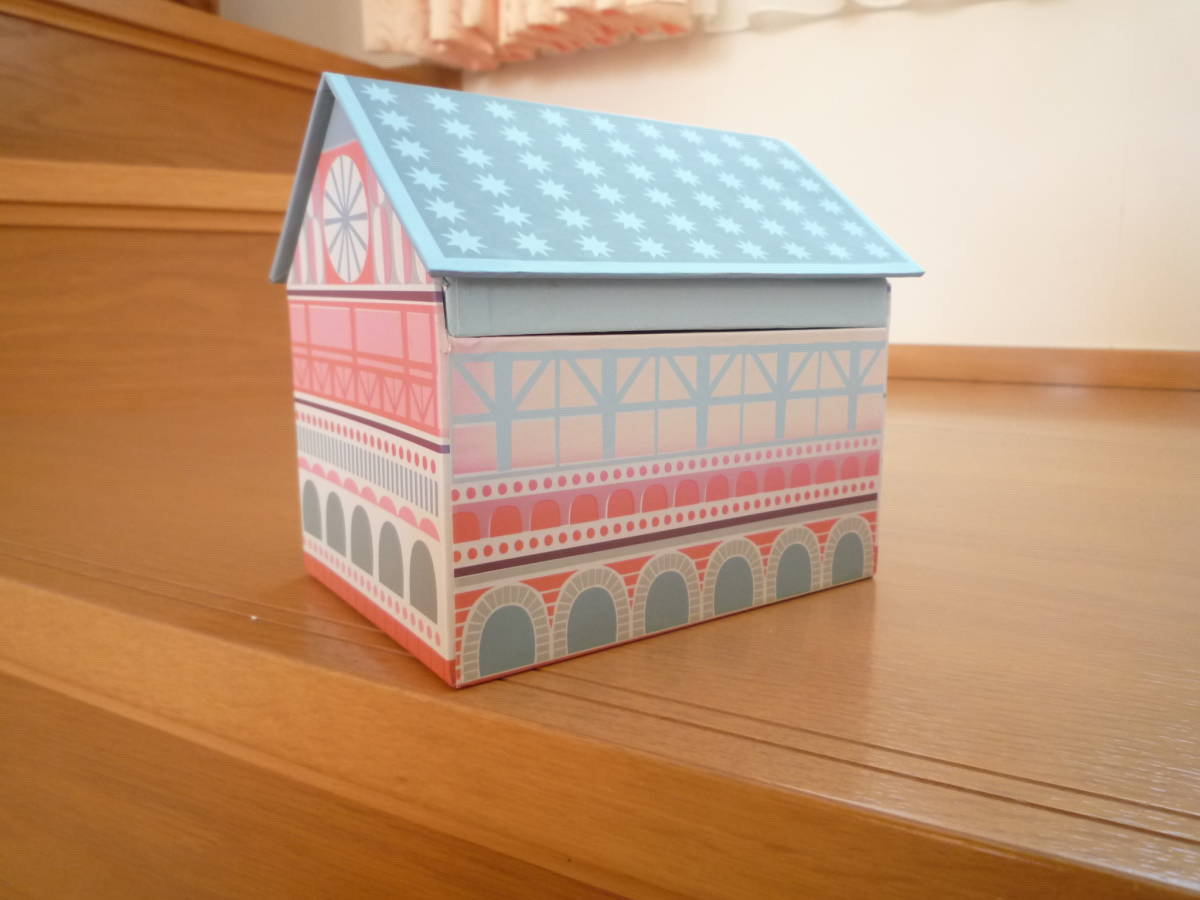 なんだかよく分からない箱ですが、形がかわいいです。 ドイツ風の木組みの家(英語で「ハーフティンバー」、ドイツ語で「ファッハヴェルクハウス」)の形をしています。 屋根をポンととって中に収納。 塗装にやや日焼けしている部分があります。 また画像6にあるように、少しだけ目立たない破れがあります。