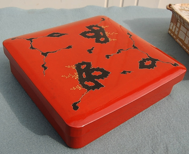 昭和初期 木製 お重:収納箱 朱塗り 五七桐文の抽象画 小物入れにも
