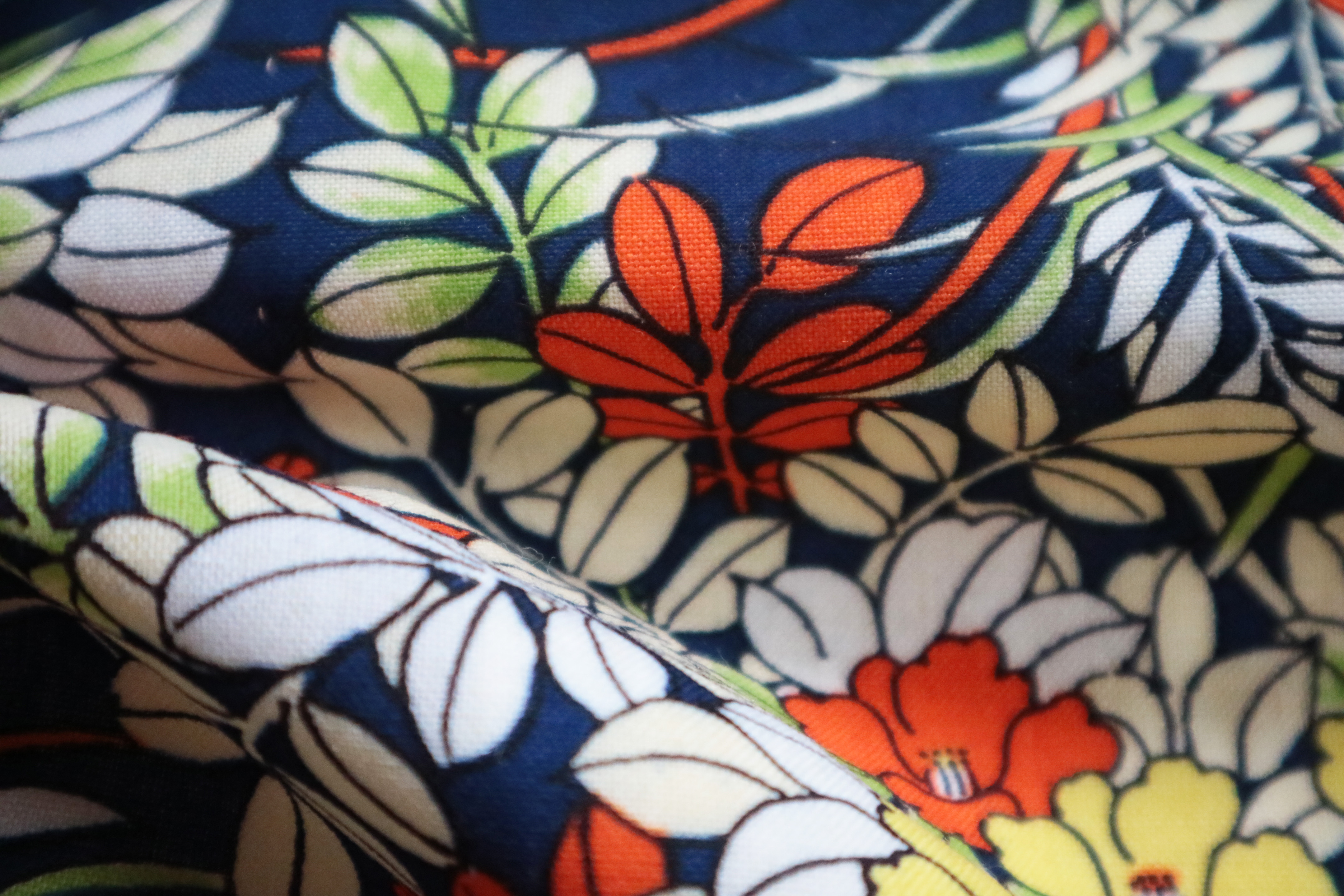 | オレンジや黄色、緑の色使いがレトロポップ!!紺の着物は紺地が多いと、暗い印象になりがちですが、色の部分が多く、華やかです。 | ||
