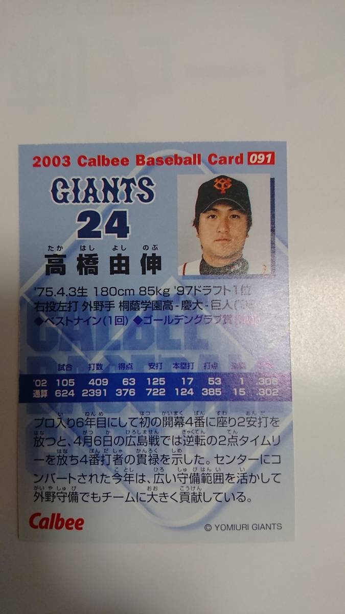2003年版のカルビーベースボールカードで、読売ジャイアンツの高橋由伸(現 ジャイアンツ監督)のカードです。