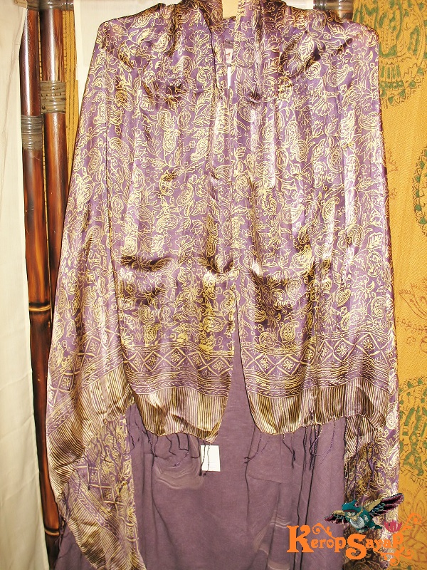 上品な光沢がきれいなつるっとした肌触りのサテンシルク素材のバティックストールです。幅が広めのタイプですがシルクなのでかさばらず使いやすいですょ。