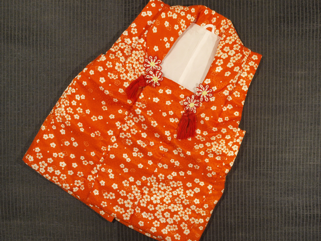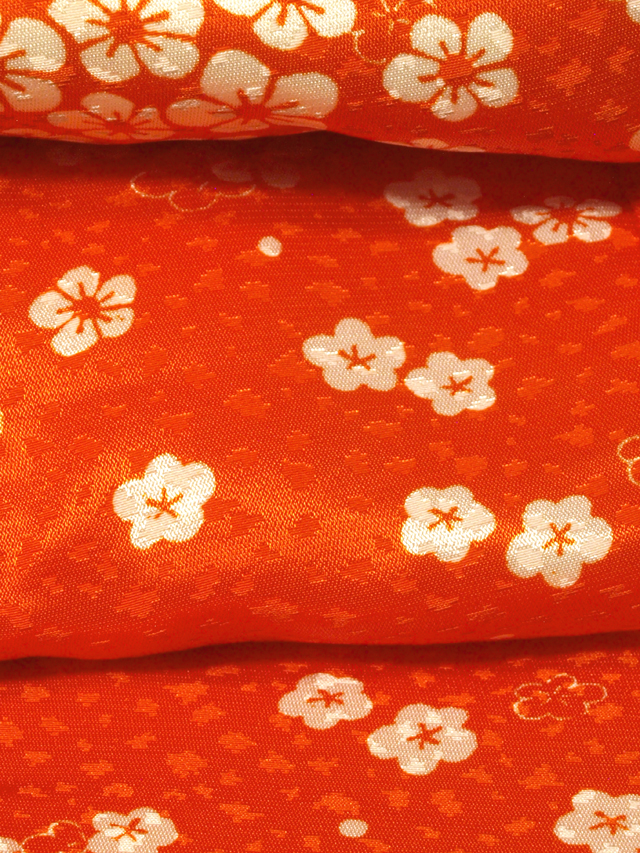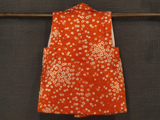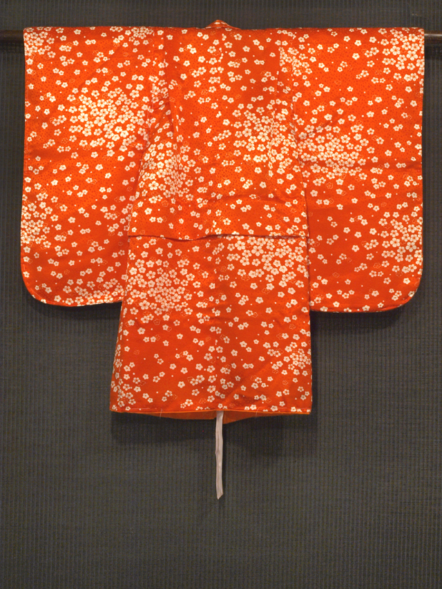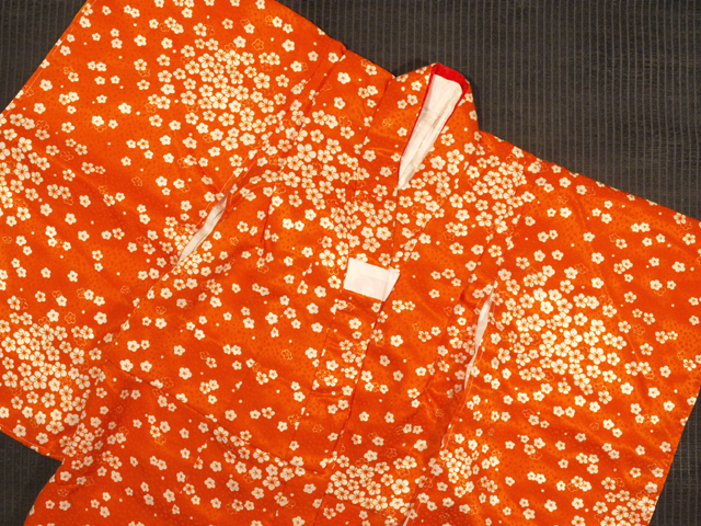 紅緋色の地に、あられの地紋が織り出され、梅の文様が染め抜かれている綸子の子ども用の洗える着物の三つ身です。袷仕立てで、長襦袢(単衣仕立て)が合わせられています。綿入れの被布着(ひふぎ)と長襦袢との 3 点セットです。 明るく華やかな意匠です。やわらかな上質の化繊地です。 しつけ付きの仕立て上がり未使用保管品で、被布着の胴裏に直径約 2cm の黄変が 1 か所ありますが、気にはなりません。そのほかに目につくしみやよごれ、褪色などのダメージはなく、きれいな状態です。 |
