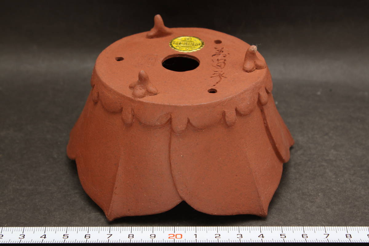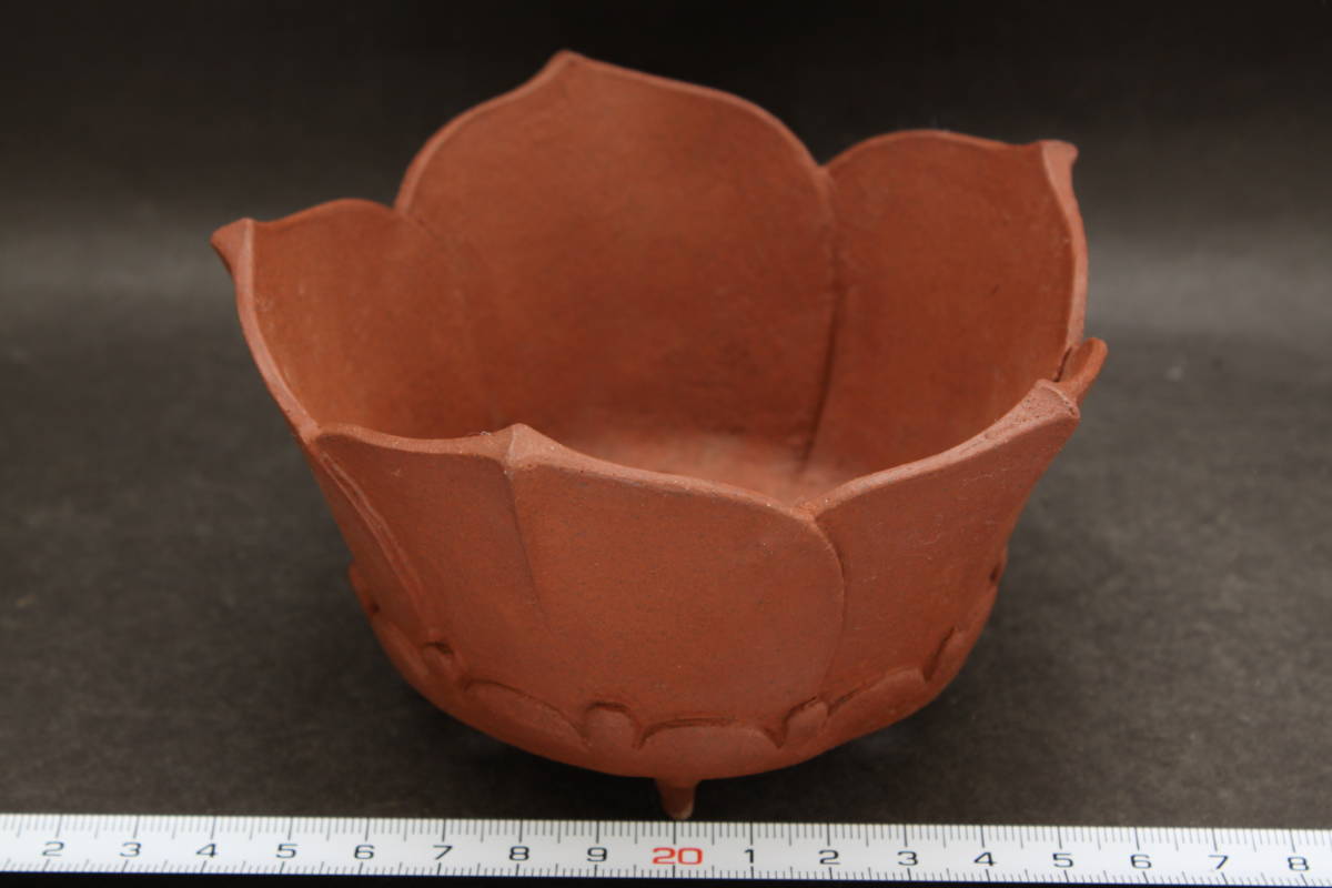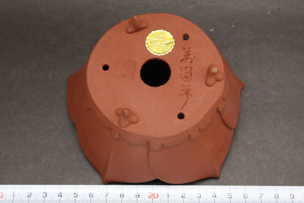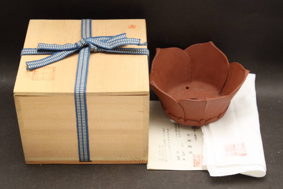 3492 明治26年創業 珍品 貴重品 径13H7.5 瑞宝単光章授与 伝統工芸士 渡辺敬深 萬留平 有趣陶苑 栞 名刺 共箱 朱泥 桃花泥 花型 蓮花足付