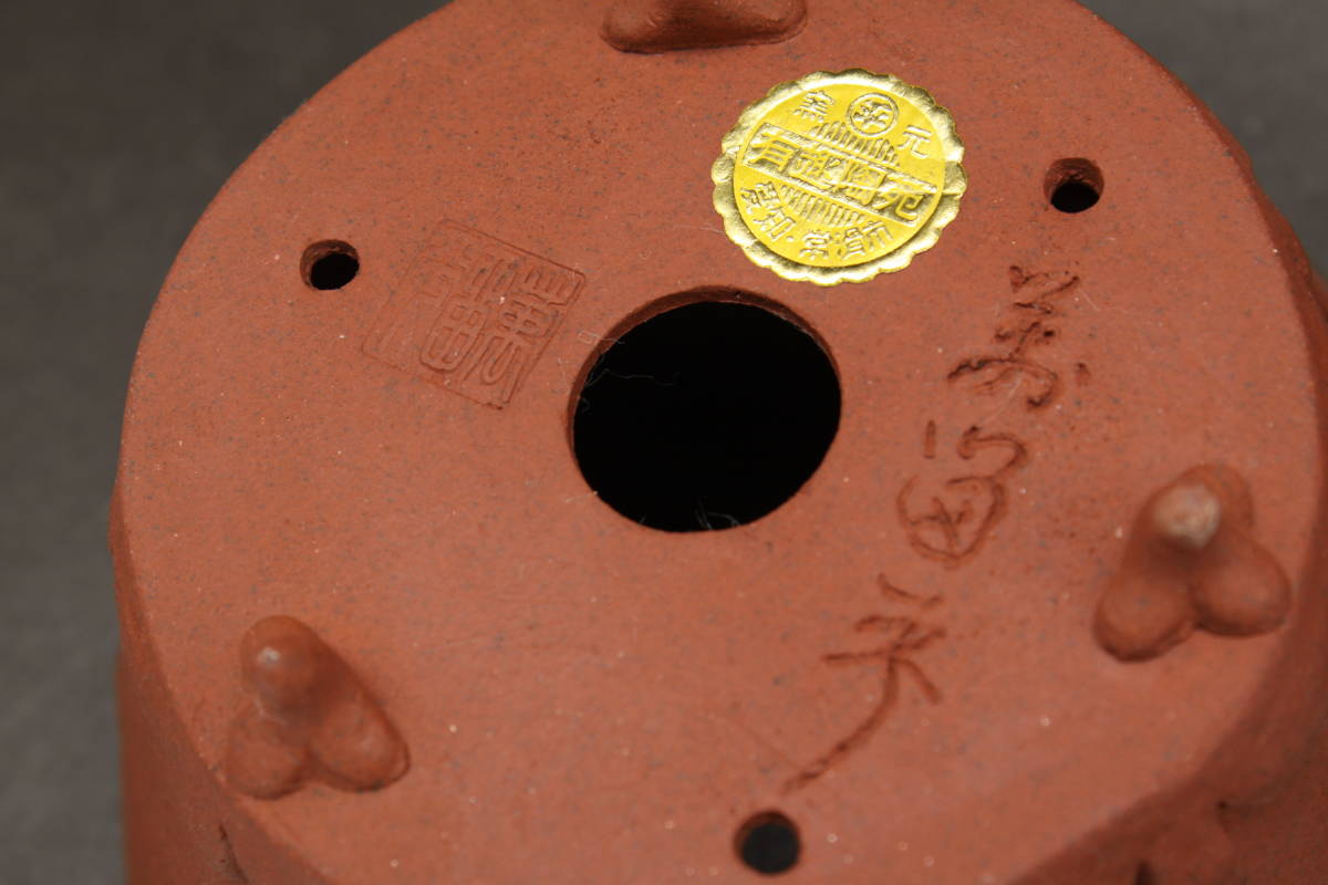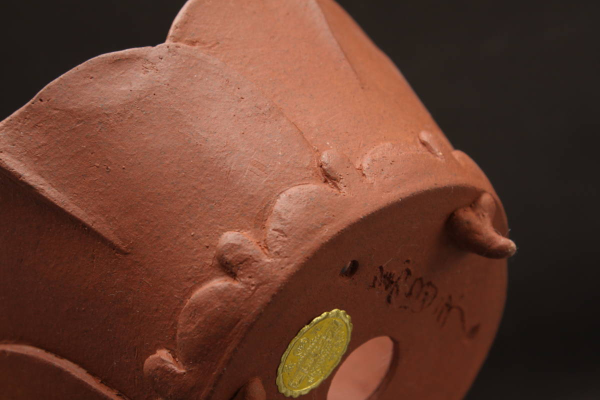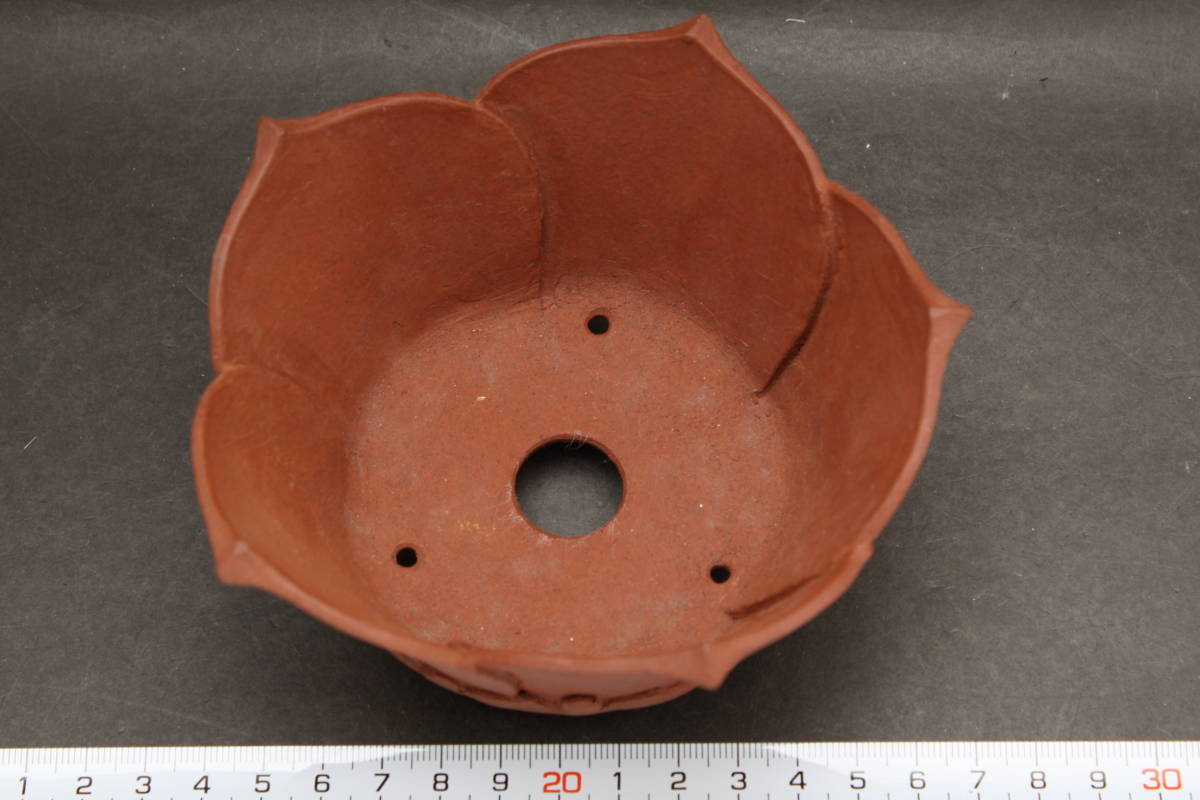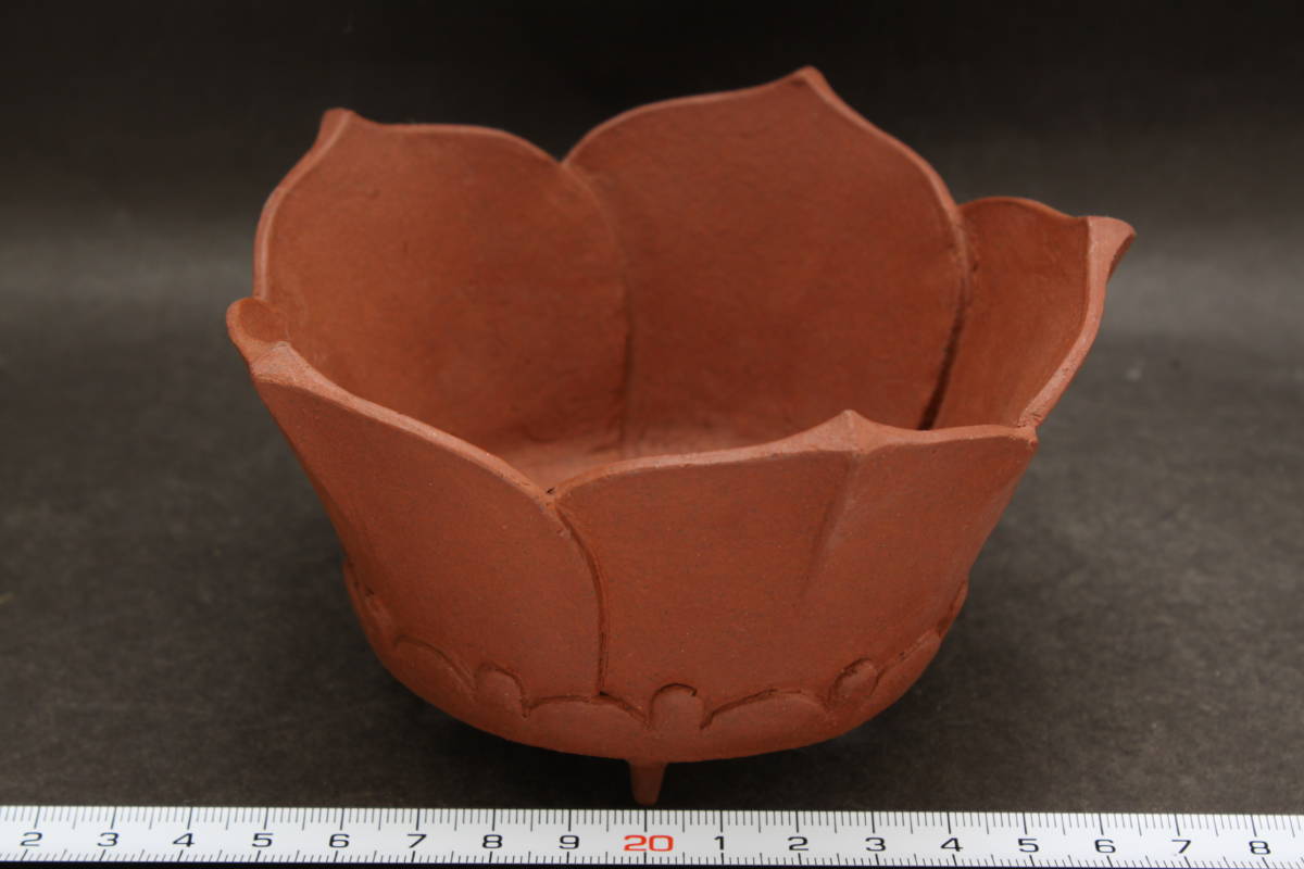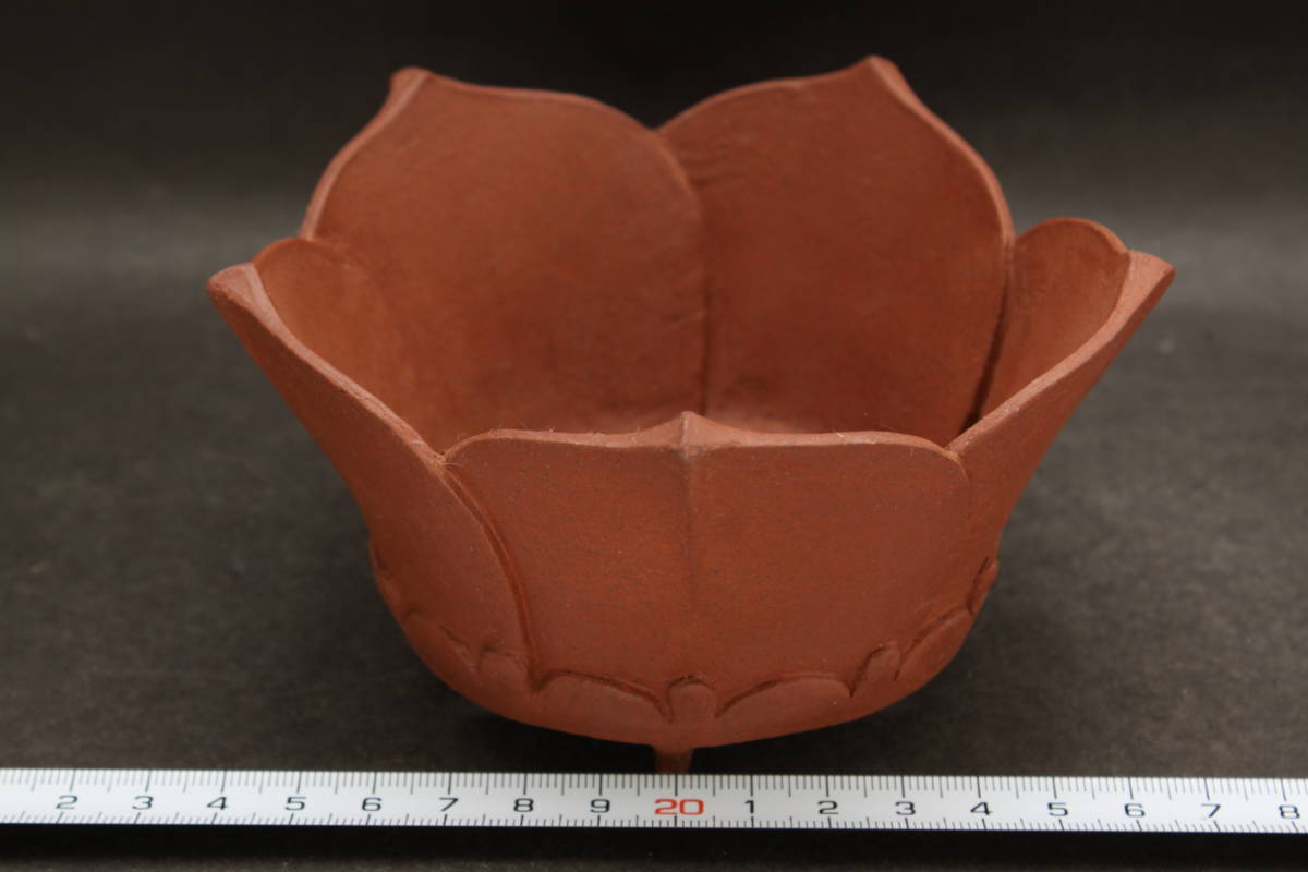 3492 明治26年創業 珍品 貴重品 径13H7.5 瑞宝単光章授与 伝統工芸士 渡辺敬深 萬留平 有趣陶苑 栞 名刺 共箱 朱泥 桃花泥 花型 蓮花足付