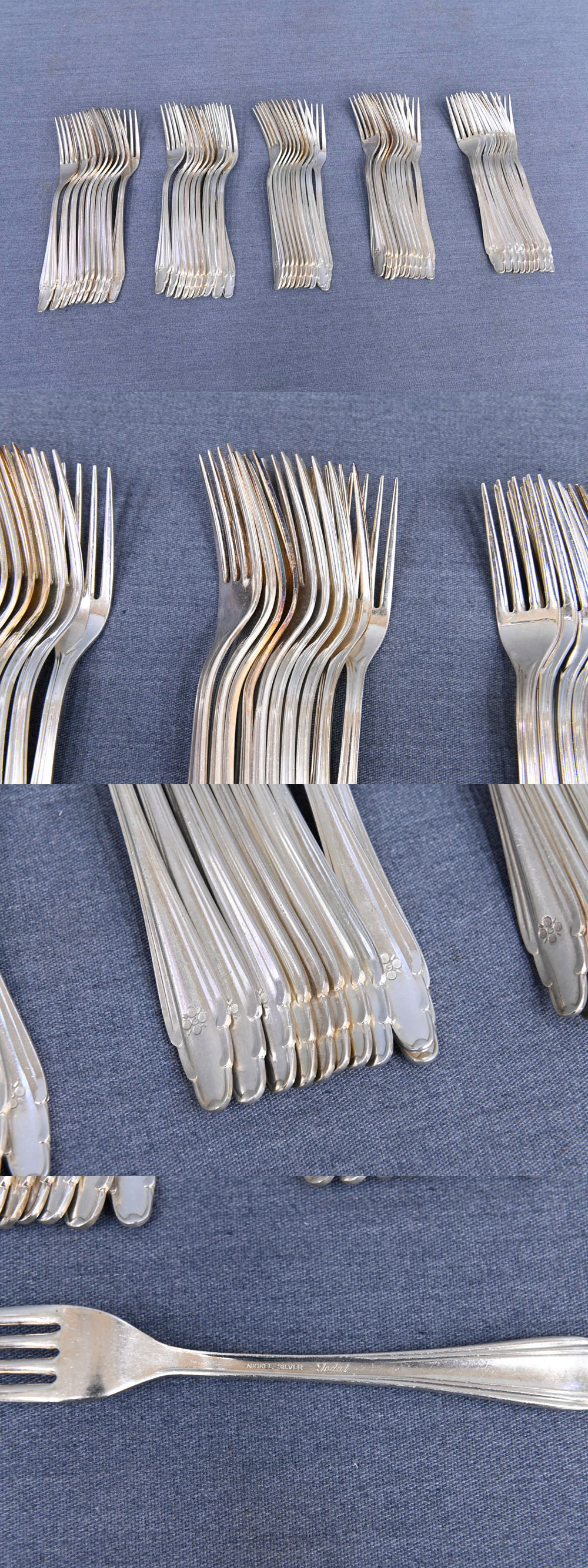 ----------------------------------------------------------------------------------------- ●送料や注意事項は必ずご確認下さい。不明な場合は落札前に必ず質問下さい。落札後にトラブルになるケースが多発しております。● ●携帯ですとアップ画像が見れず、画像が一枚しか表示されない場合があります。● ◆コンディションは写真・文章にて記載して有りますが、全てのキズの写真は掲載致しておりません。大きなダメージを除き見落とし、記載漏れが有る事はご了承下さい。 ◆当サイトにて出品する商品は多種多彩で、当方商品知識の無い物も多数ありますので落札後の質問やメンテナンス等にはお答えできません。 ◆入札された時点で、画像、文章をご理解していただいたものと判断させていただきます。不明な点は前もってQ&Aからお願い致します。入札後の質問やお電話等でのキャンセルは一切受け付け致しません。 ---------------------------------------------------------------------------------------- 銀メッキ、洋銀フォーク50本、中古品の出品です。 全長18㎝ こちら中古品ですのでキズや変色、一部変形等のイタミ有りますのでノークレームノーリターン商品となります。 | ||