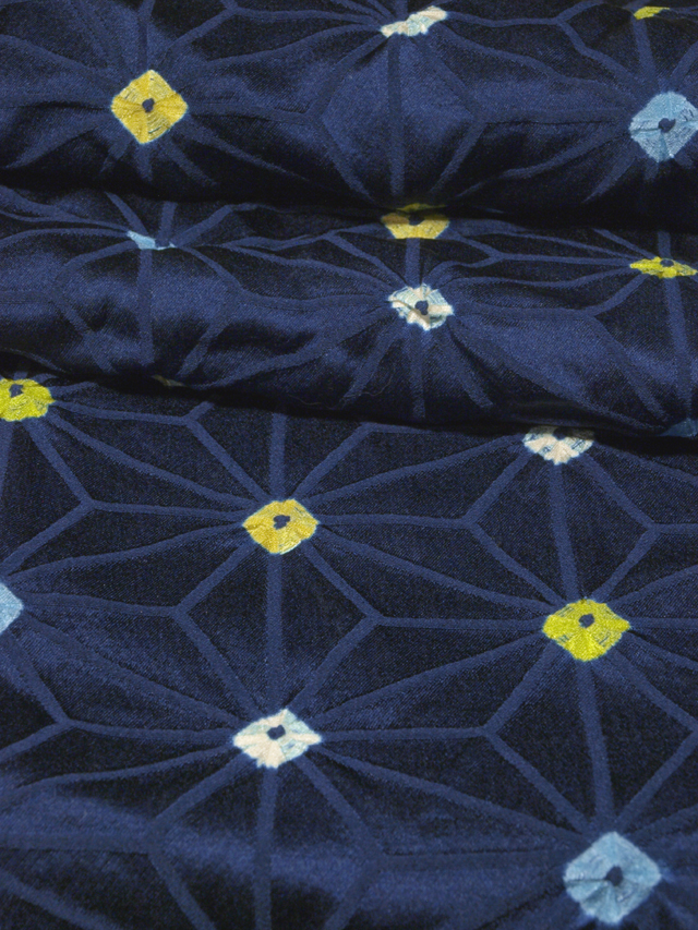 瑠璃紺(るりこん)色の地に麻葉の地紋が織り出され、絞り染めが施されている、綸子のショールです。 星空を思わせるようなお色目がきれいで、かわいらしい雰囲気です。なめらかな手ざわりの綸子地です。 ユーズド品と思われますが、使用感はほとんど感じられません。目につくしみやよごれ、褪色などのダメージもなく、きれいな状態です。 |