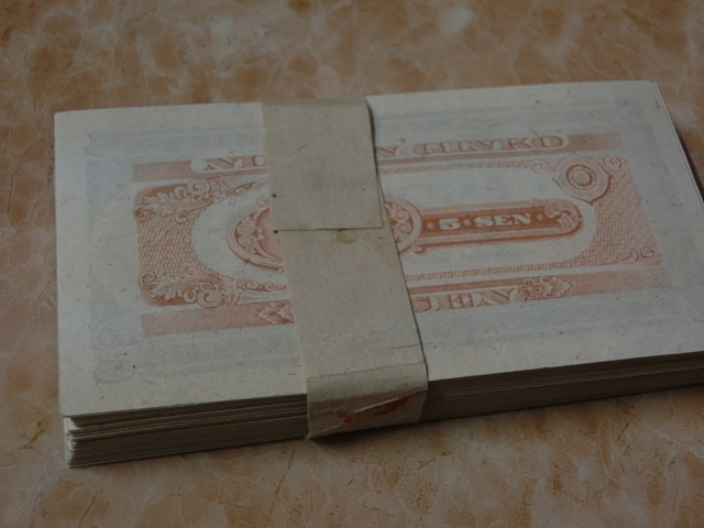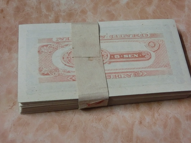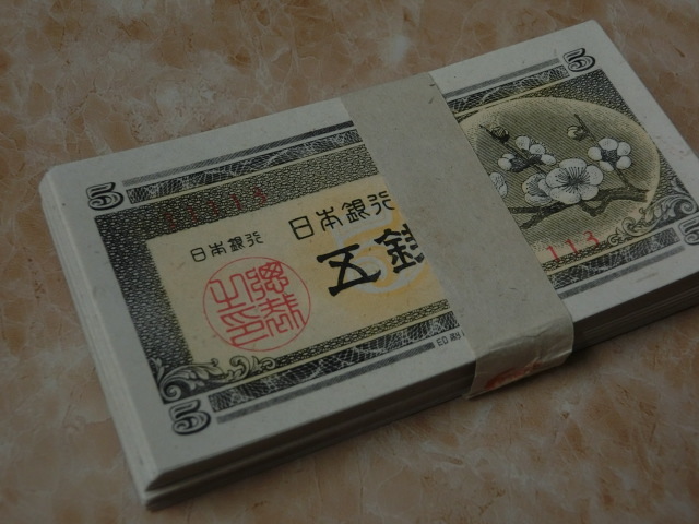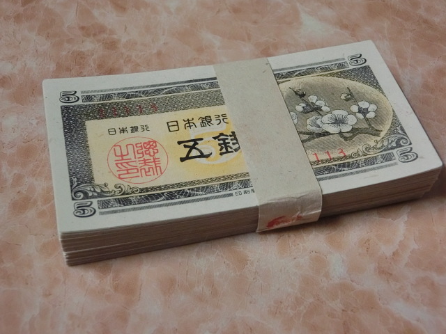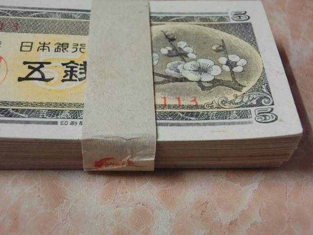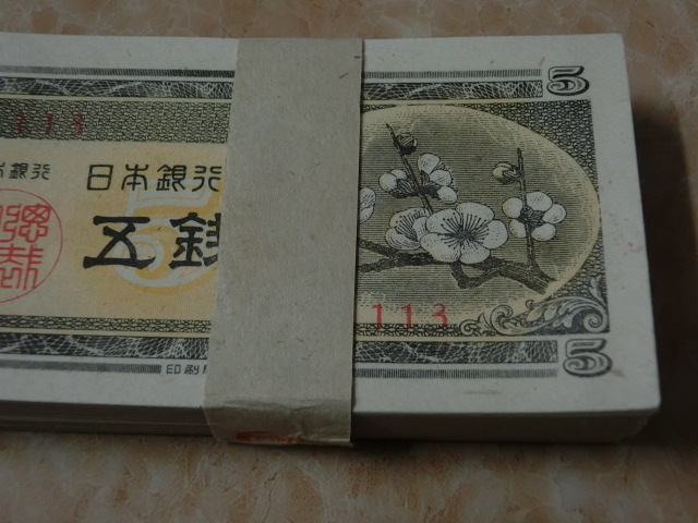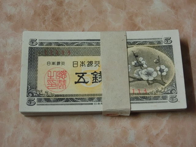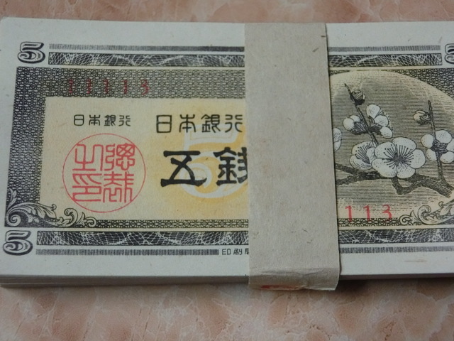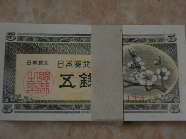 日本銀行券A号5銭 梅5銭の同番(11113)・未使用を100枚です。