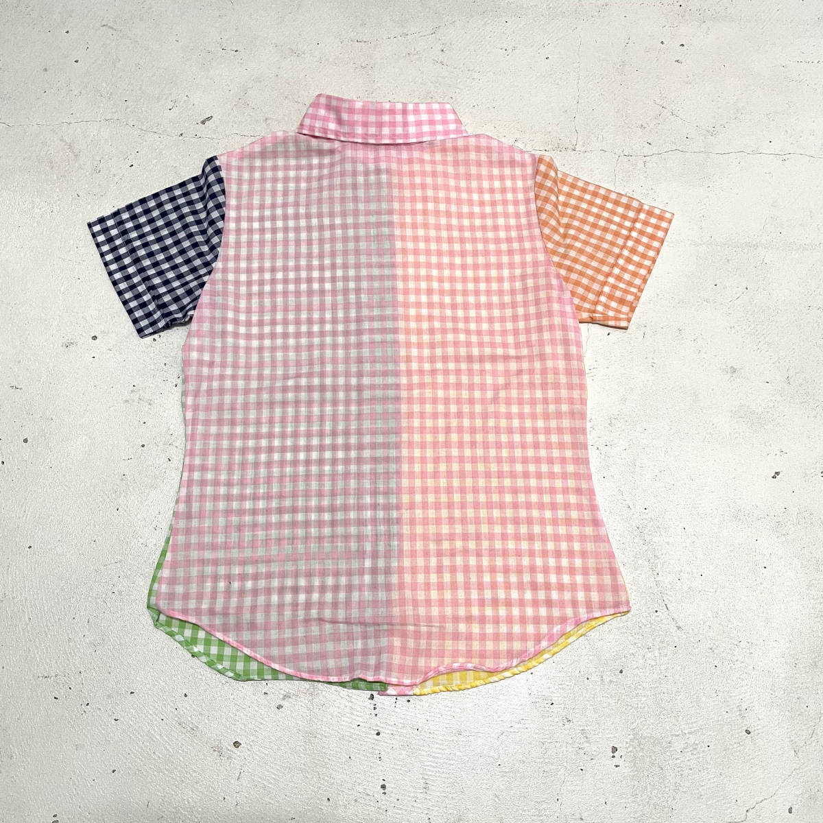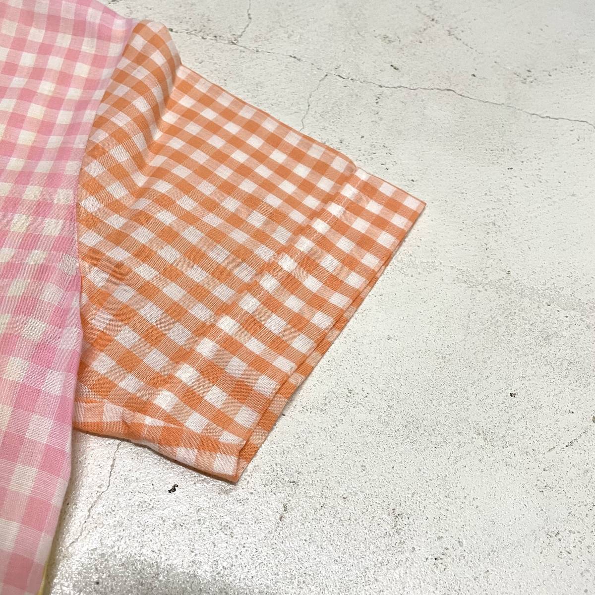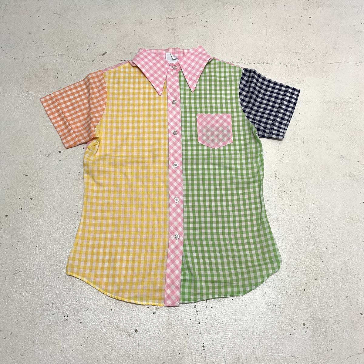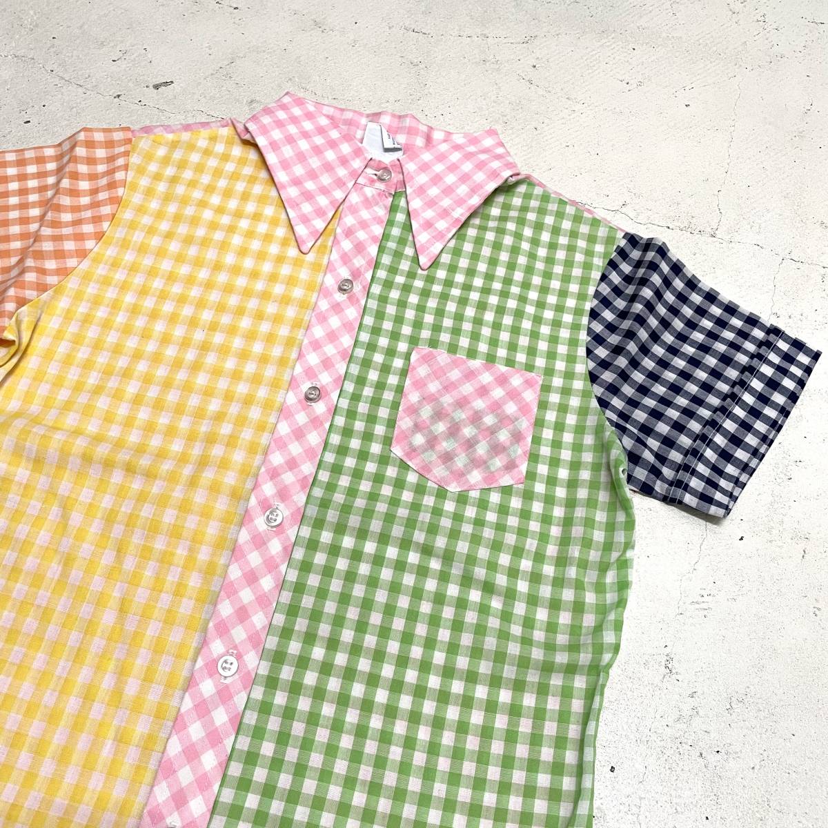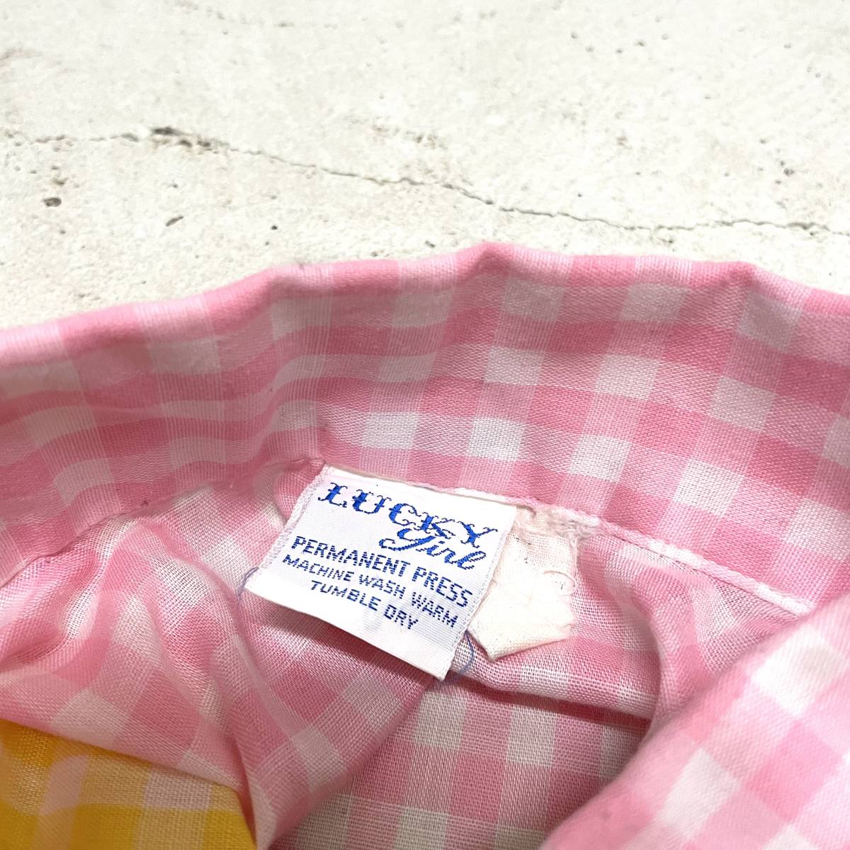 1970年代のビンテージです。 薄手のシャツ生地。 クレイジーカラーのギンガムチェック切り替えデザインが良いですね。 袖はダブルです。 海外キッズサイズですので着用感レディースXSサイズ程度です。 洗濯済みになります。お探しの方におすすめです。 | |||