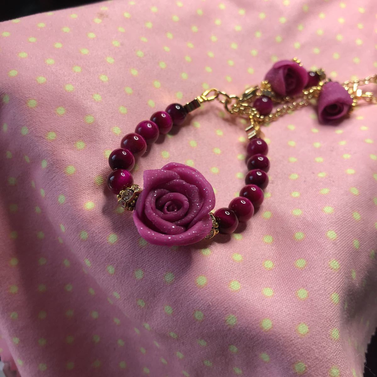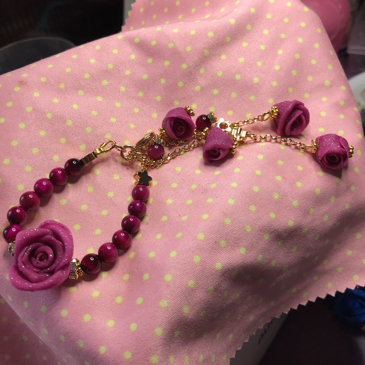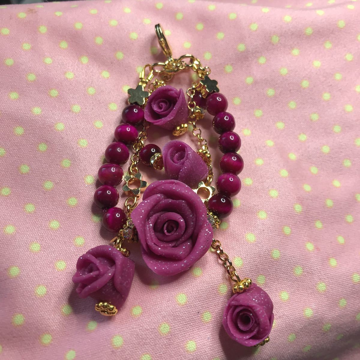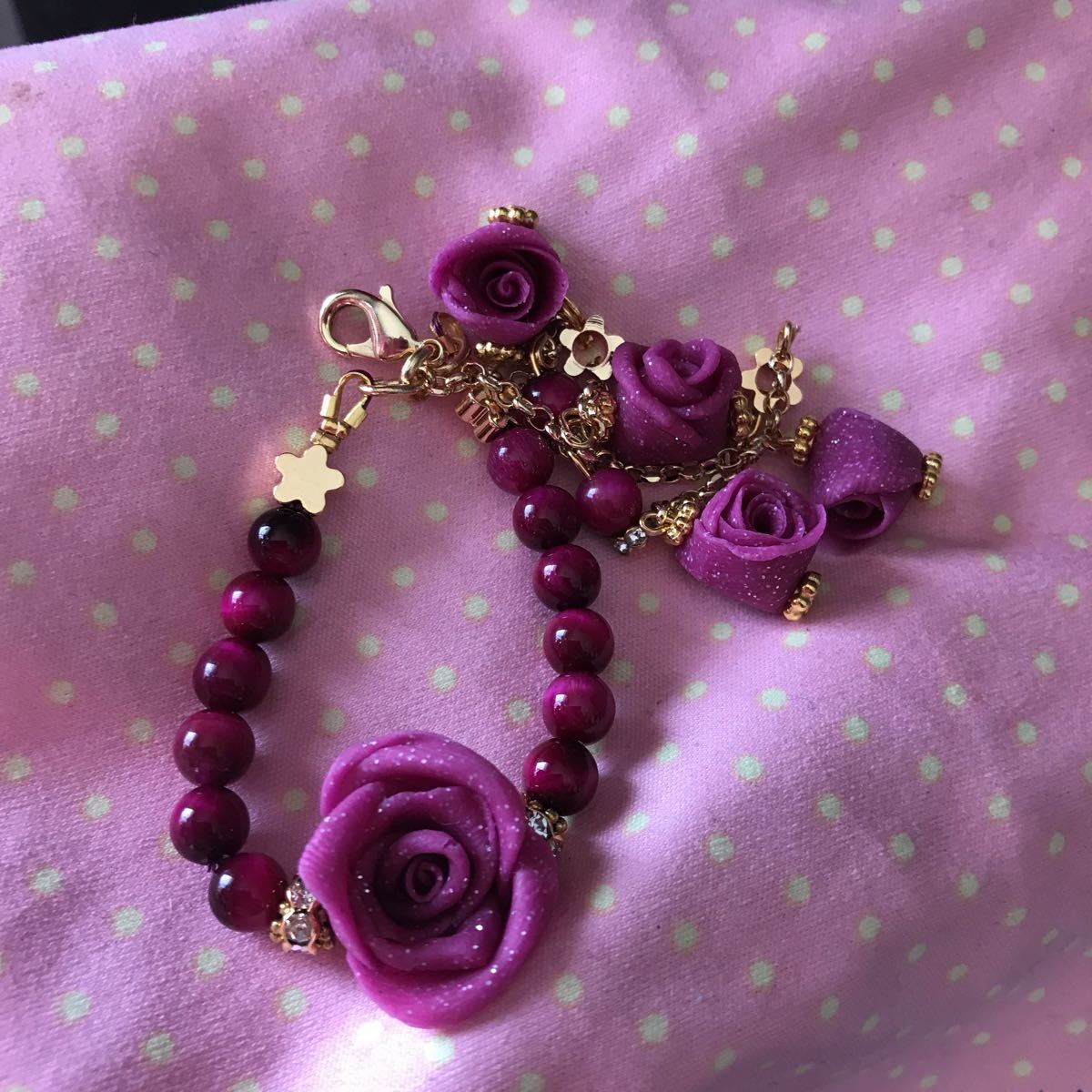 タイガーアイは6ミリ使用しております.お花パーツやラメ入り薔薇など細部にまでこだわりました。金運仕事運ご上がるといわれるタイガーアイですので是非付けてみてください