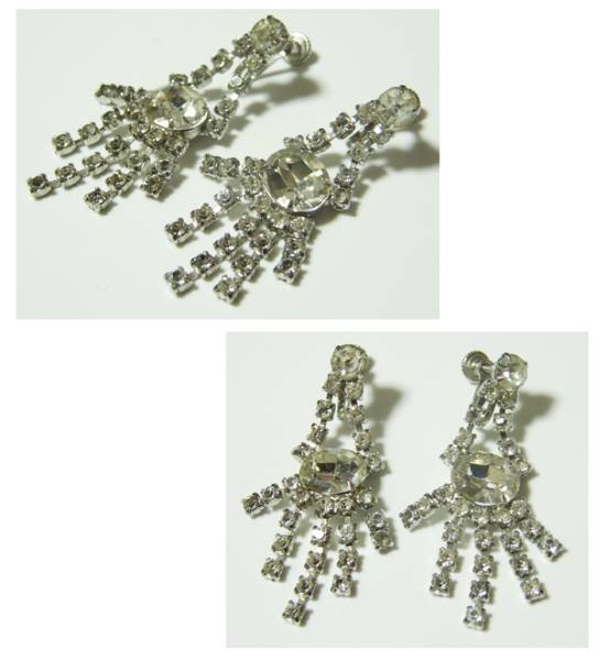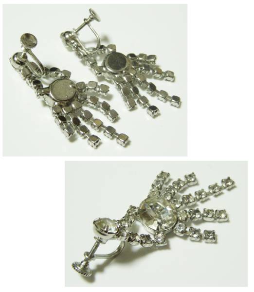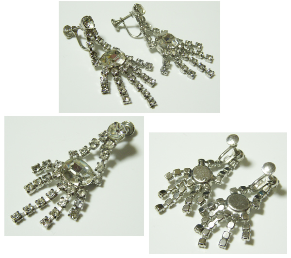 レトロ ラインストーン イヤリングです。状態は、古い物ですので、薄い擦れはありますが、レトロの雰囲気ある可愛い物です。アメリカで購入しました。デザインや作りがとても綺麗です。長さ5.4cm、横幅2.5cm程です。古い物とご理解頂いて、ノークレーム、ノーリターンでお願いします。