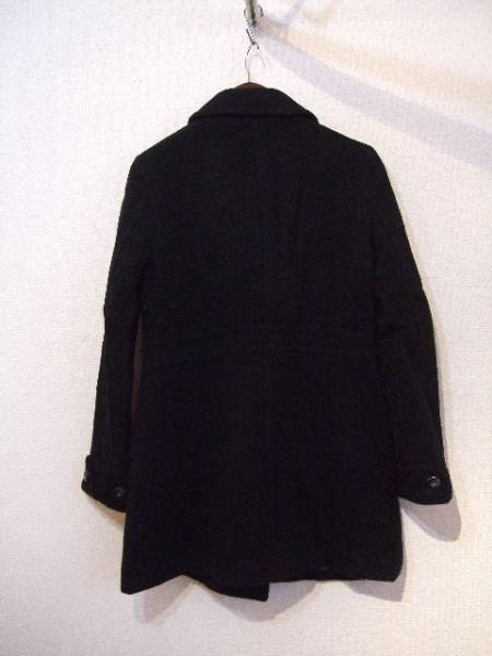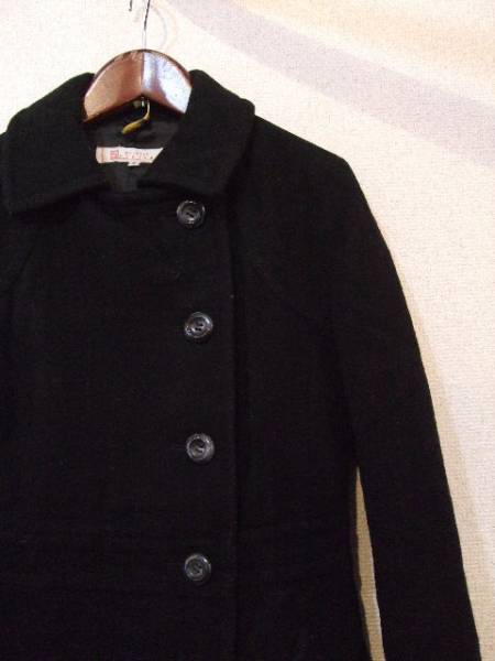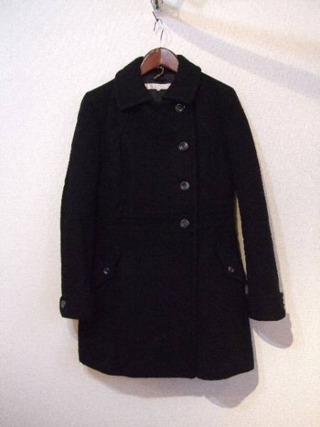 | 商品紹介 | 左側にボタンが付いたちょっと個性的な形のコートです。 ウエストは切替えでややシェイプしていて、広がりの少ない スッキリした形です。 色は黒で他のアイテムと合わせやすく、着まわしやすいデザインです。 《素材》 表地:毛90% ナイロン10% 裏地:ポリエステル |