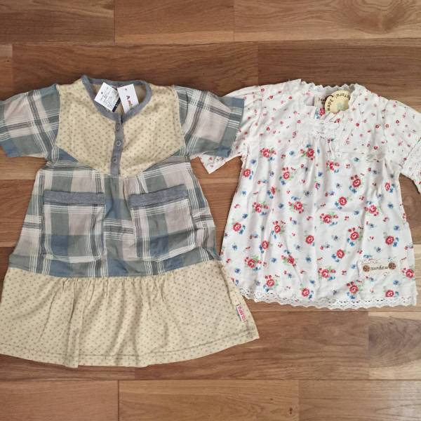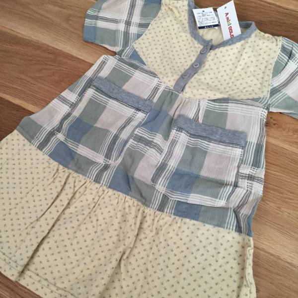 ベースのプチフラワー柄と、ブルーグレー系マドラスチェックの組み合わせがオシャレなワンピです。