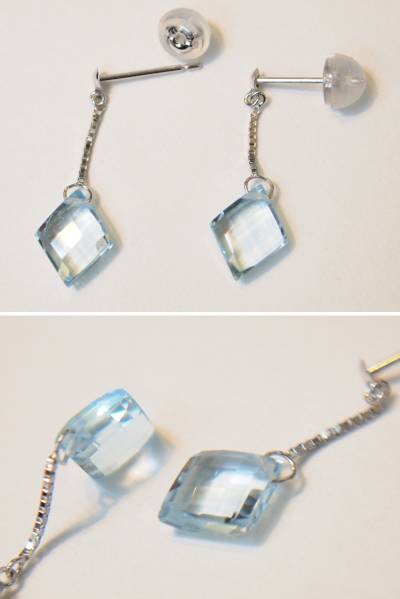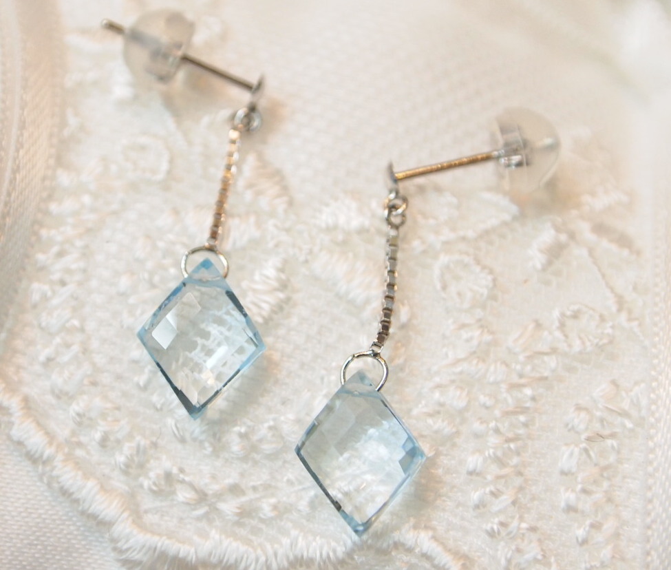 表面に格子状の「チェッカーボードカット」が施された菱形のブルートパーズがチェーンで繋がれていて、ユラユラ、キラキラと大変綺麗なピアスです。