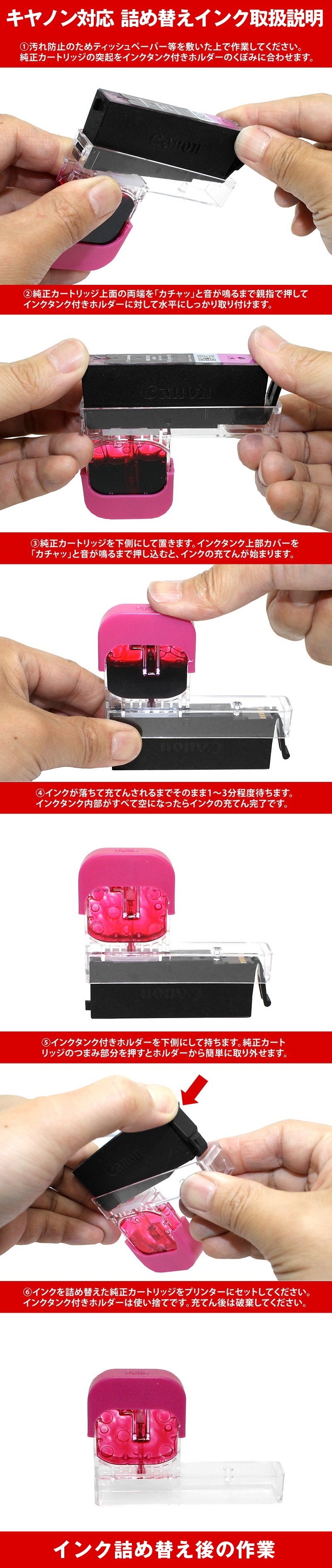 【 商品説明 】 ★純正カートリッジはインクが無くなると廃棄でもったいないと感じていませんか?エコインクの「詰め替えインク」は空になった純正カートリッジにインクを繰り返し詰め替えることができます。 ★純正カートリッジに詰め替えるため、ICチップを読み取らない様なトラブルは一切ありません。 ★汚れず、簡単作業で詰め替えができます。 ★カートリッジを再使用することで、1個当たり270円(税込)で使用可能で、印刷コストを大幅に削減することができます。 ★純正インクカートリッジに詰め替えるので、純正品と同等の印刷品質です。安いから印刷品質は?と思われる方も、安心してご使用頂けます。