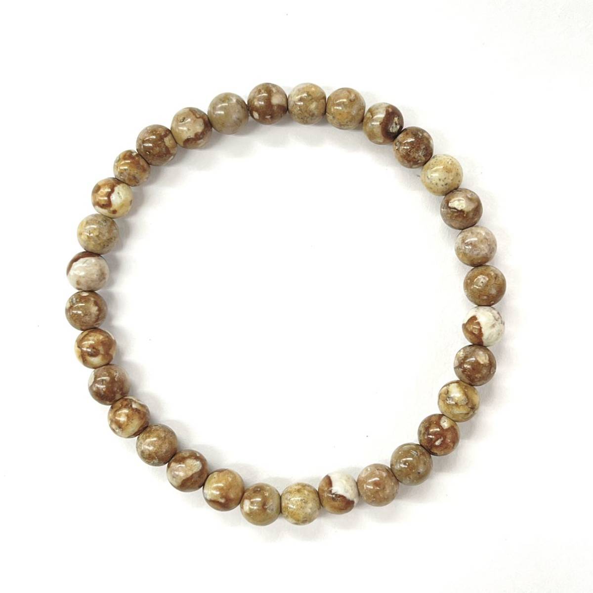 茶色がかった模様が入った姫川薬石の原石で作ったブレスレットです。原石の外側の部分を使用したビーズになります。含浸処理などを行っていないナチュラルな姫川薬石で、表面には原石特有の凸凹が見られます。
