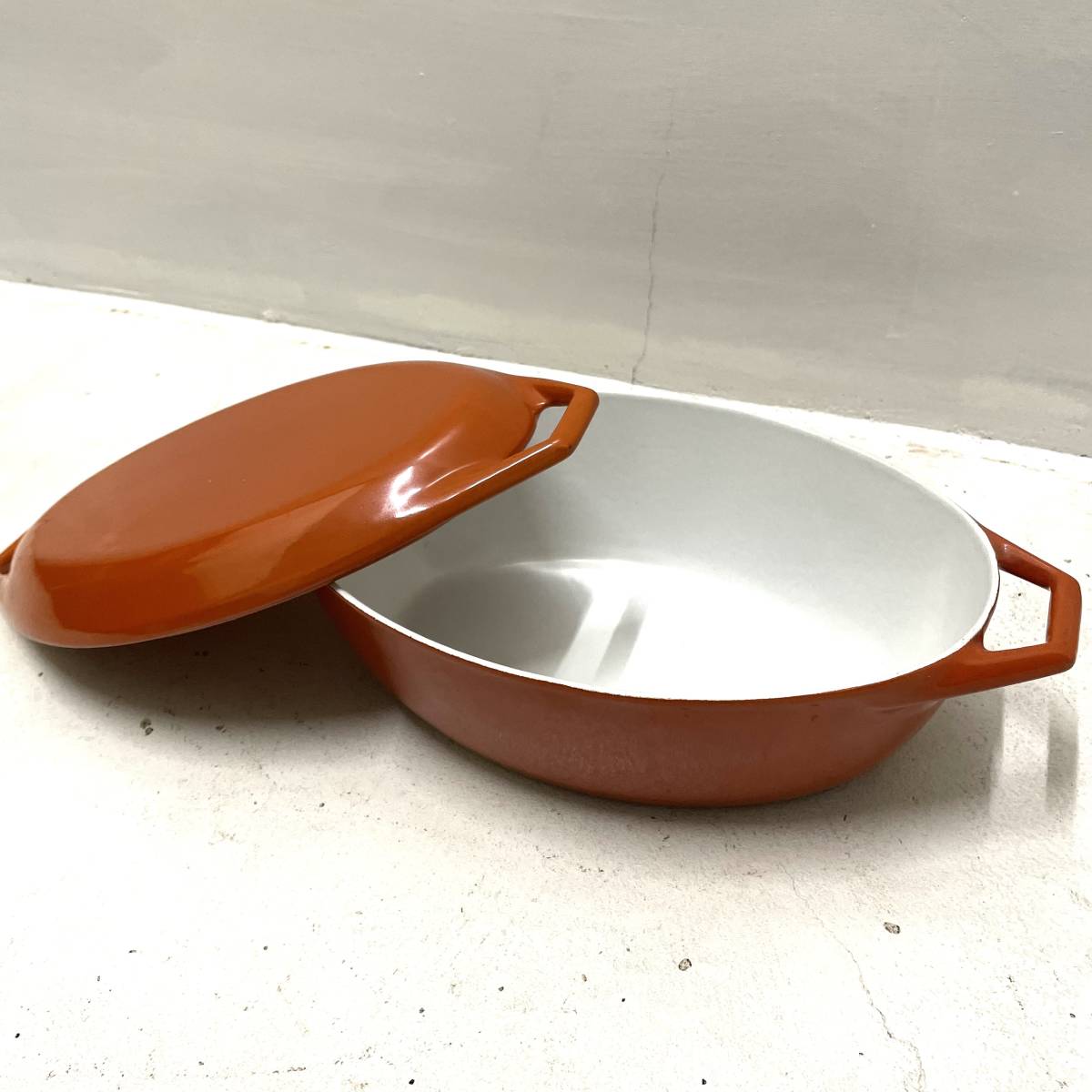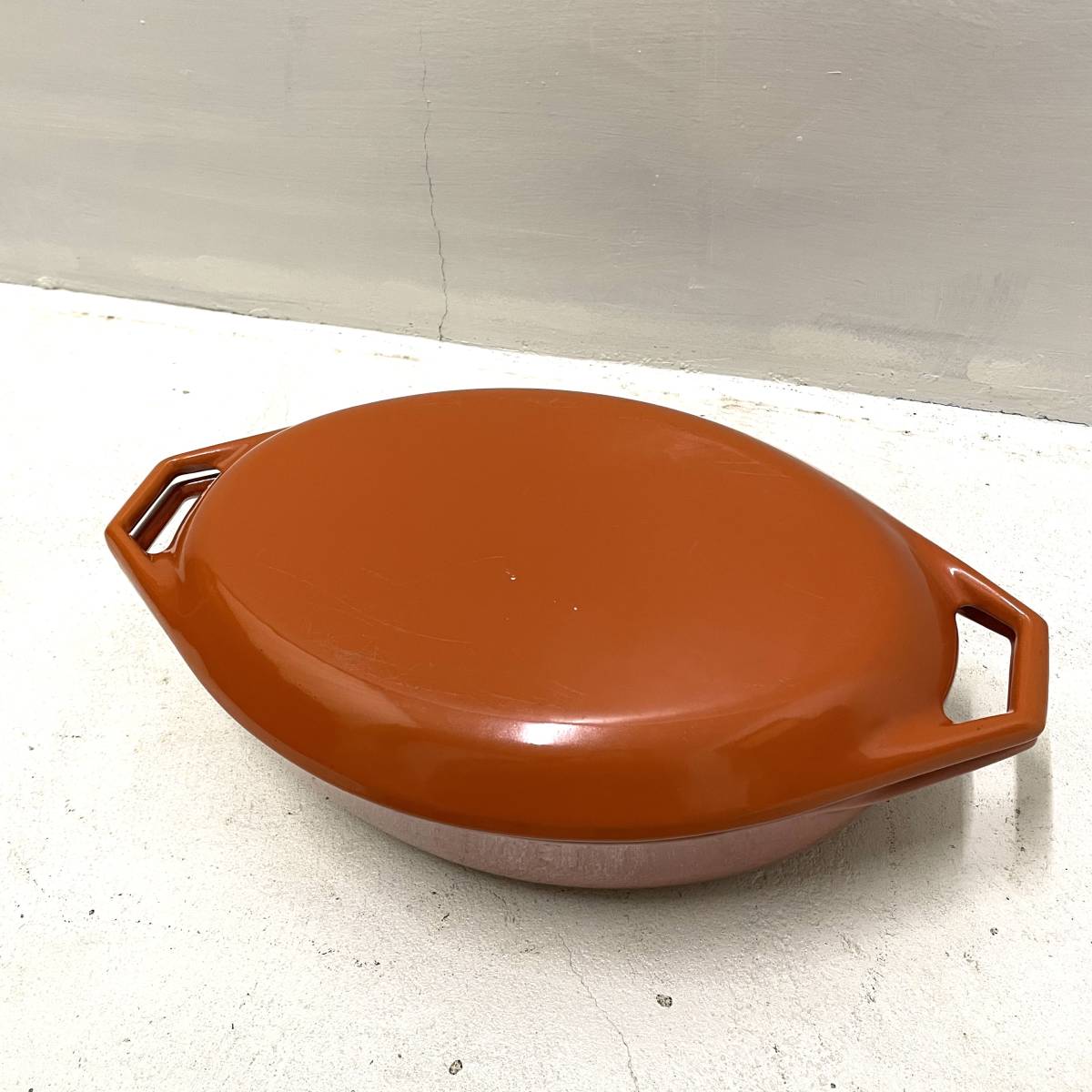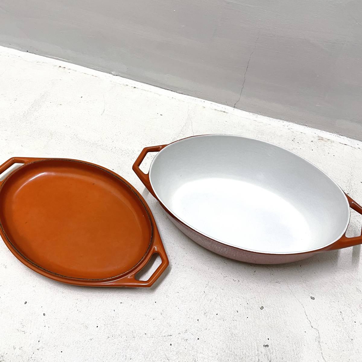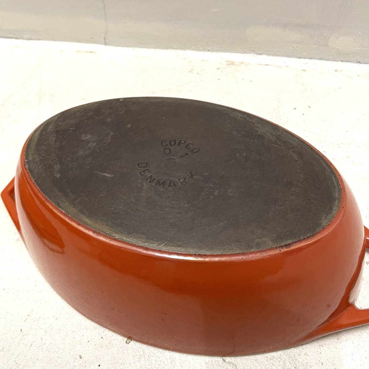 60~70年代コプコ社製のホーロー鍋です。 会社自体はアメリカですが作られたのはデンマークになります。 通常のアンティークホーロー食器と比べかなり分厚い金属が使われており重量もありますが丈夫ですよ。 目立つような塗装禿による錆などもありません。 艶もあり、鍋としての使用も可能だと思いますが、インテリアとして飾っても良いですよ。 口径28×19センチ、深さ8.5センチ、取っ手2.8×8センチ。 お探しの方におすすめです。 | |||