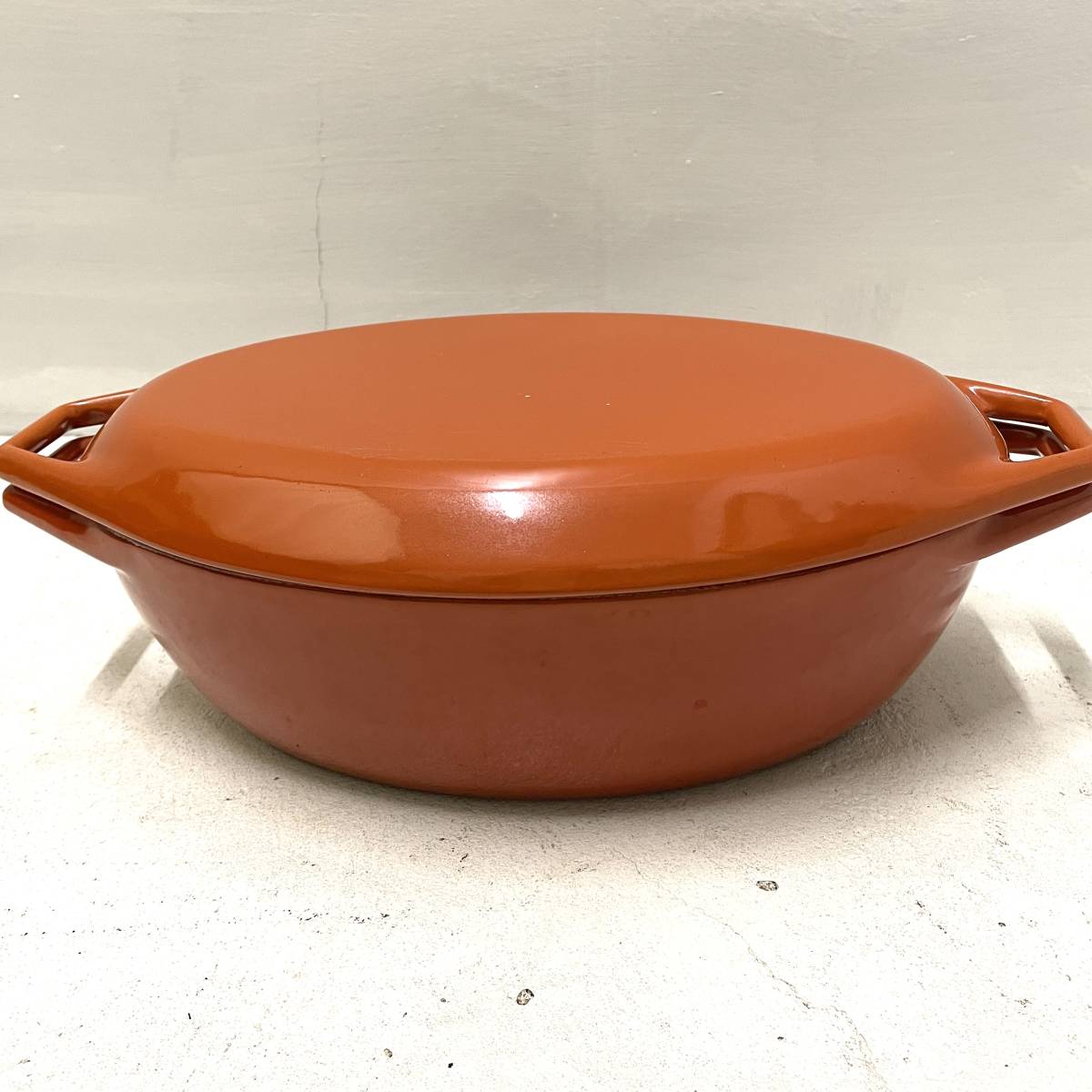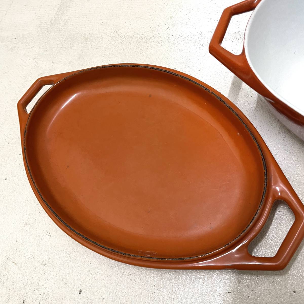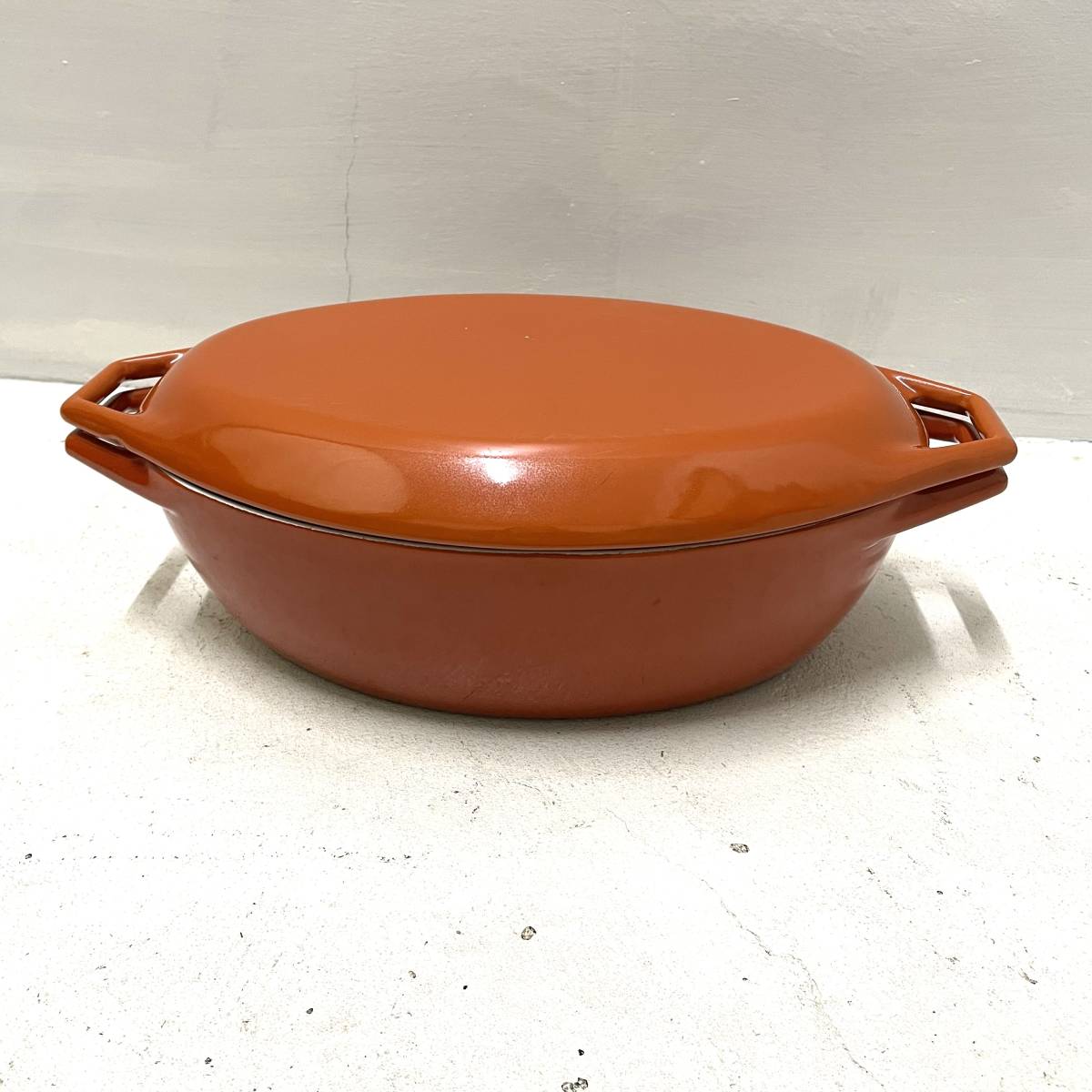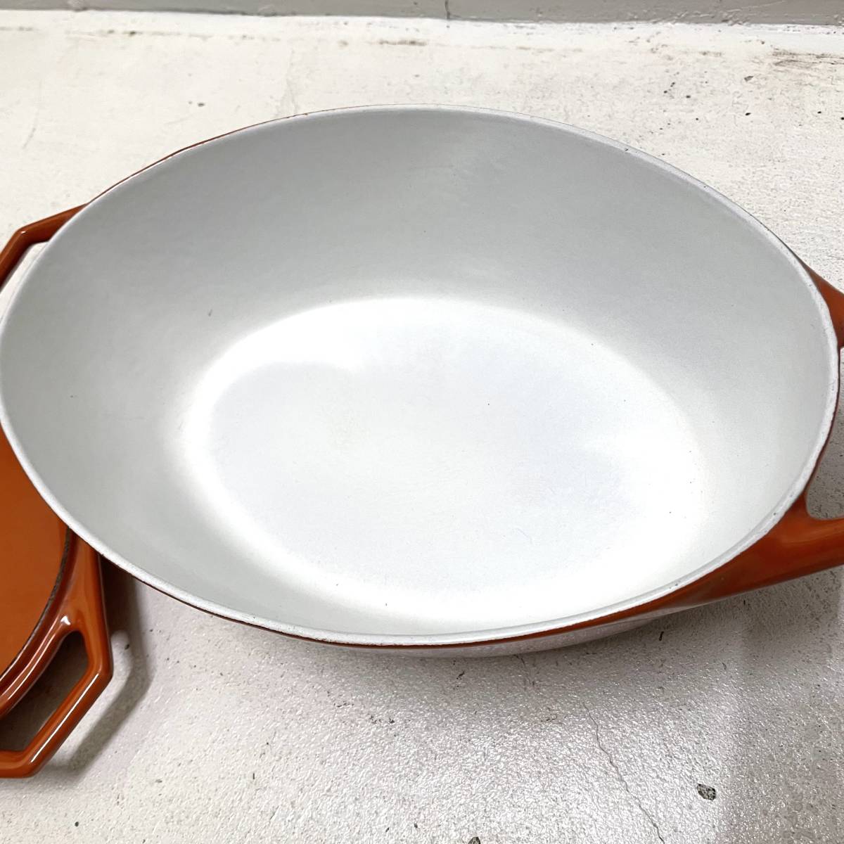 60~70年代コプコ社製のホーロー鍋です。 会社自体はアメリカですが作られたのはデンマークになります。 通常のアンティークホーロー食器と比べかなり分厚い金属が使われており重量もありますが丈夫ですよ。 目立つような塗装禿による錆などもありません。 艶もあり、鍋としての使用も可能だと思いますが、インテリアとして飾っても良いですよ。 口径28×19センチ、深さ8.5センチ、取っ手2.8×8センチ。 お探しの方におすすめです。 | |||