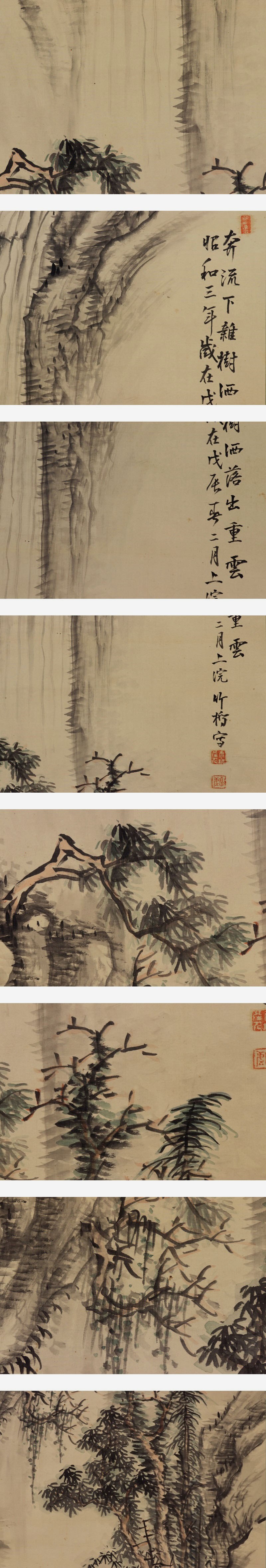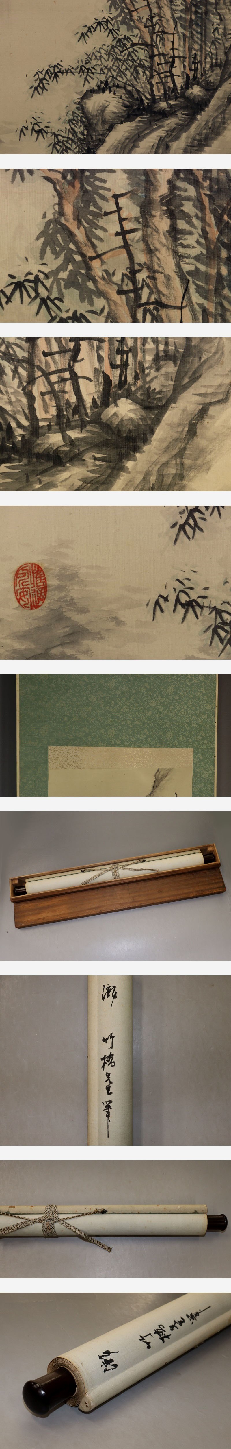 小野竹喬 おの-ちっきょう(1889-1979) 日本画家。岡山県生。名は英吉。竹内栖鳳の門に学ぶ。 大正7年土田麦僊らと国画創作協会を創立。 帝展・新文展で活躍し、戦後は日展で重きを成す。一貫して日本の自然に取り組み 清澄な透明感の中に豊かな詩情と独特の滋味のある画風で、 風景画の分野に確固とした新視覚を示し続けた。京都絵専教授。 芸術院会員。文化功労者。文化勲章受章。昭和54年(1979)歿、89才。 本紙は、染み、ヤケがあります。 表装は、染み、汚れ、皺、虫食い、破れがあります。 【サイズ】 作品 横約41cm×縦約130cm 表装 横約56cm×縦約208cm |
