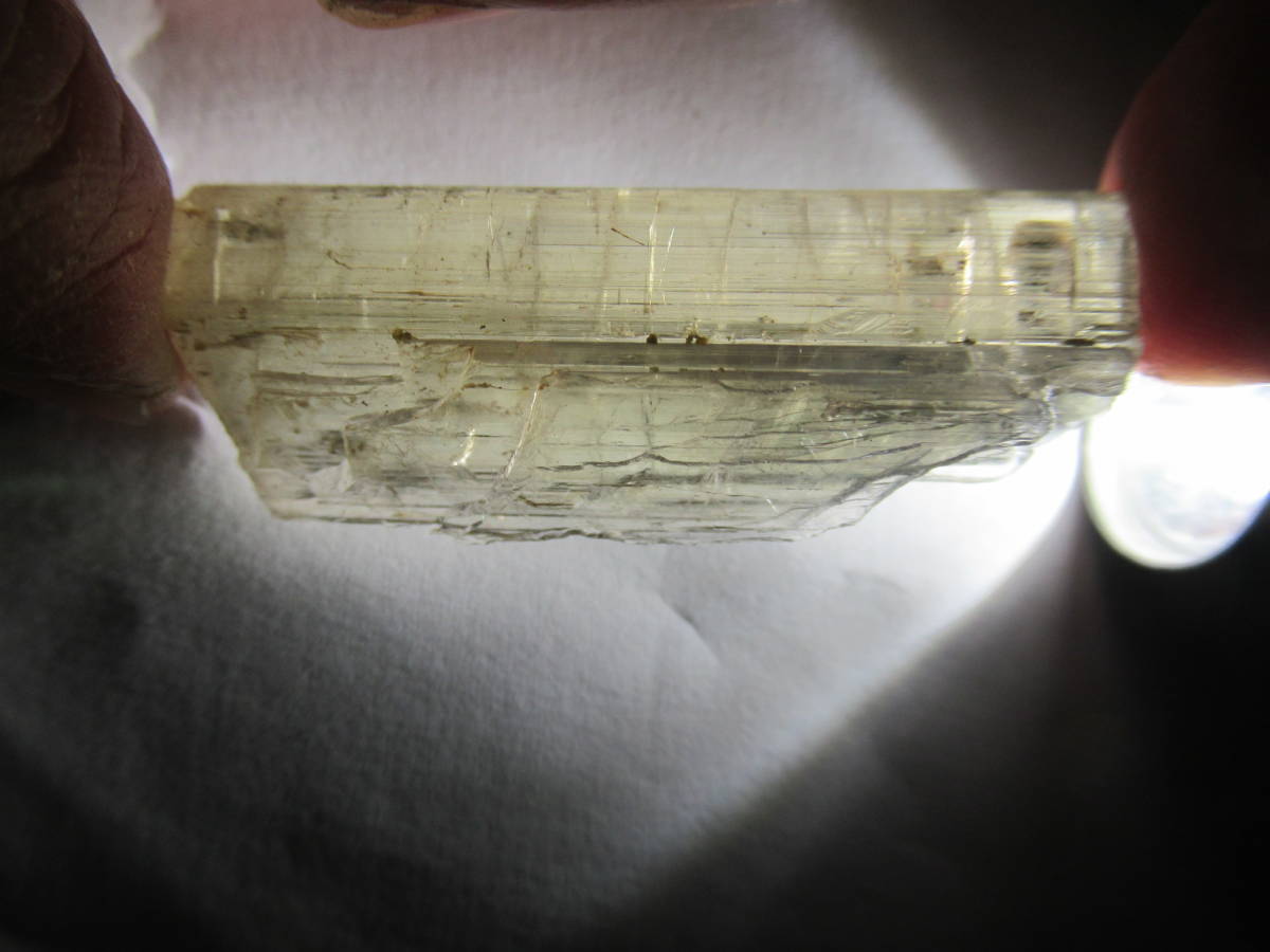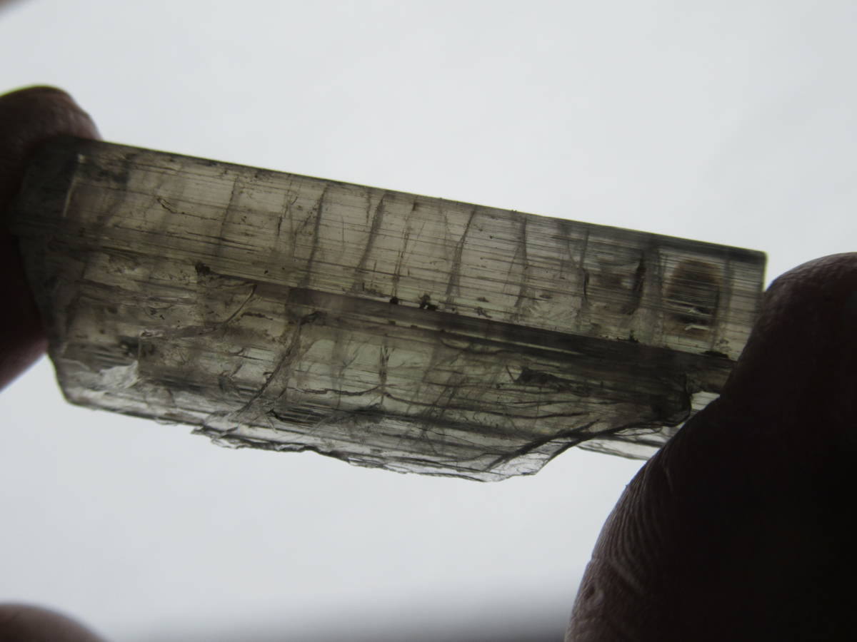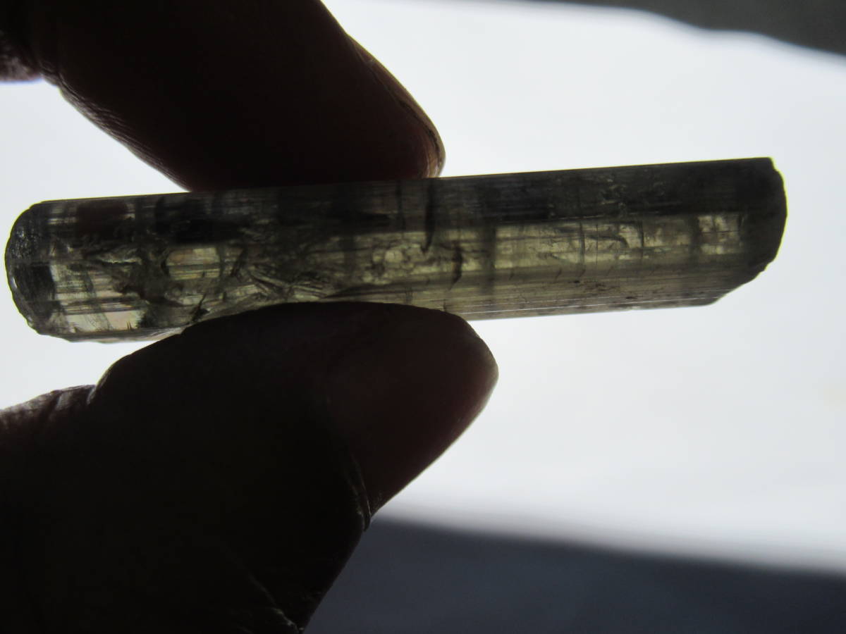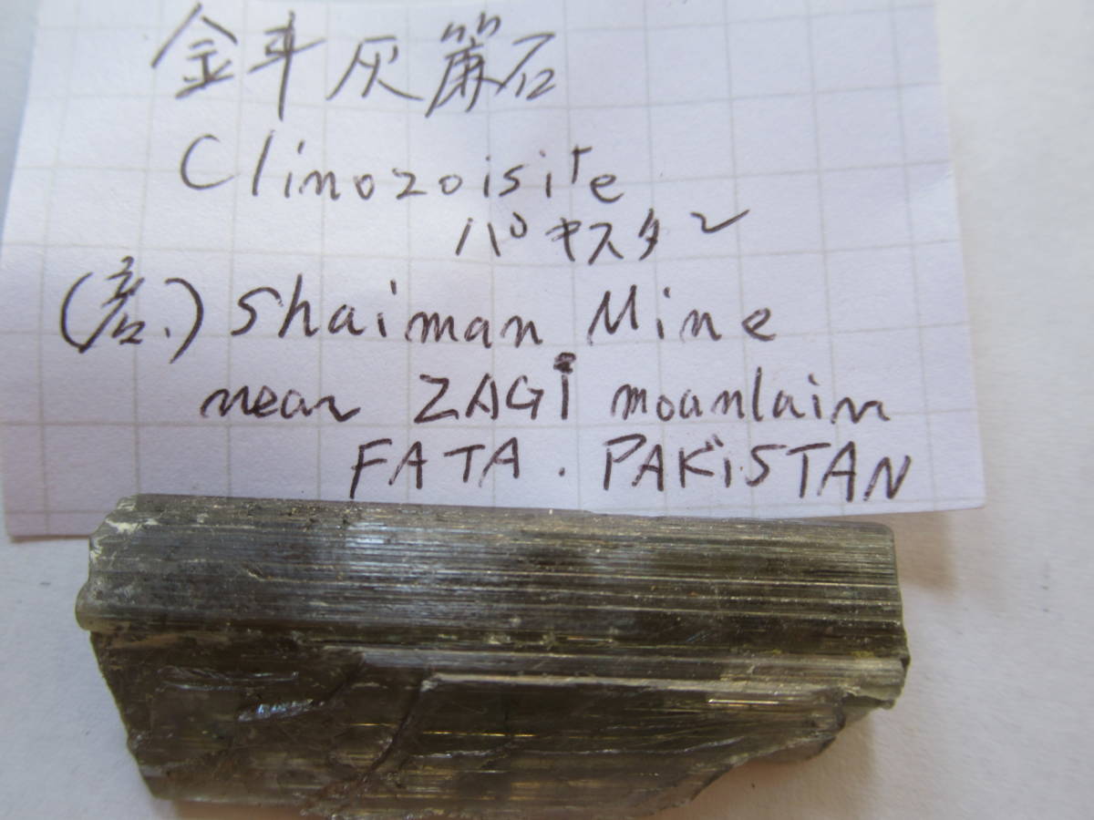Clinozoisite(斜灰簾石)パキスタンカシミールShaiman Mine near Zagi,Moanlain,Fata,Pakistan。パキスタン産クリノゾイサイトでは黄色系のものが宝石として流通していますが本品は薄いオリーブ色ないし灰緑色で、結晶の端は一方gs平坦で粘土質が付着しもう一方はほぼ平坦ですが細かい結晶面が密集していてその一定方向に反射光が見られますので細い平行連晶だと思われます。柱面は3面に結晶成長のタテ筋が明らかで1面は劈開面。内部は透明度はそこそこですが底面に平行ですが劈開ほど直線的ではい糸くず様の不透明線が十数本見られ、同様な形の浅いヒビが表面近くにまばらに見られます。サイズタテヨコ高さ16/9/42mm、重さ7,8g。送料無料。