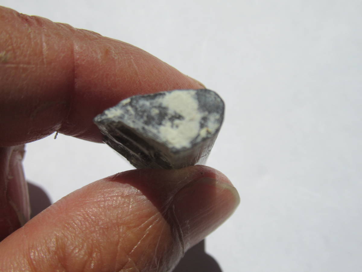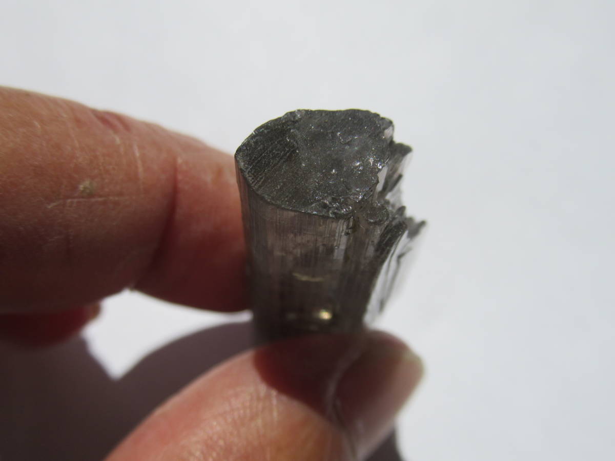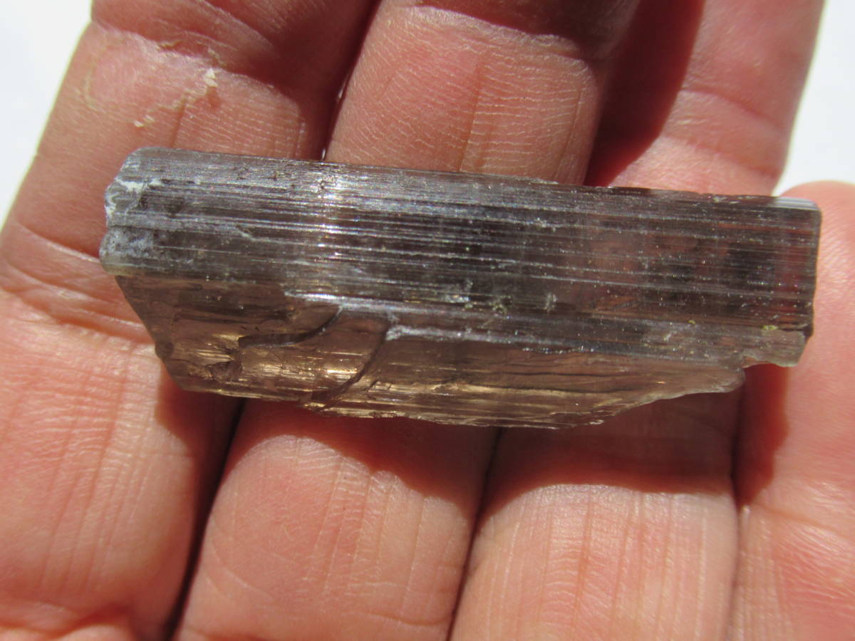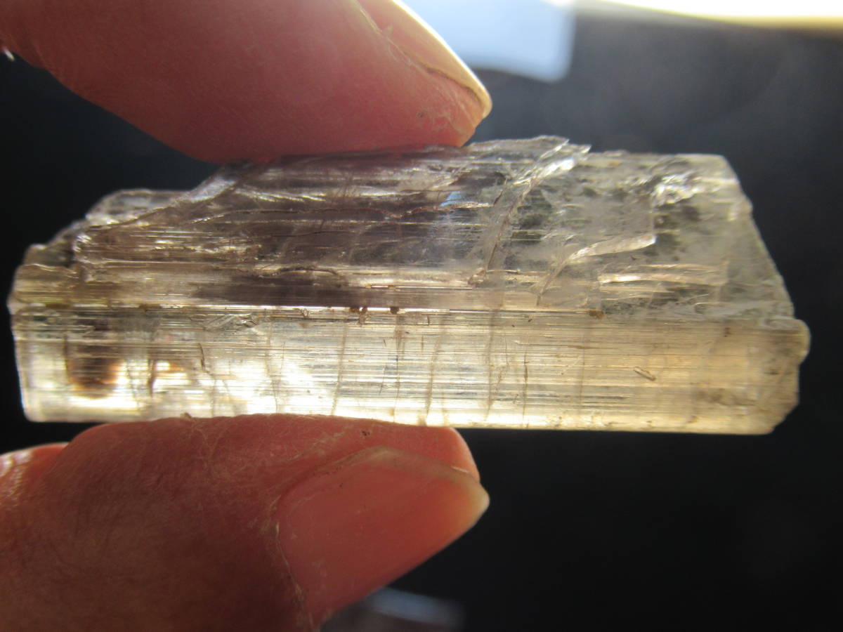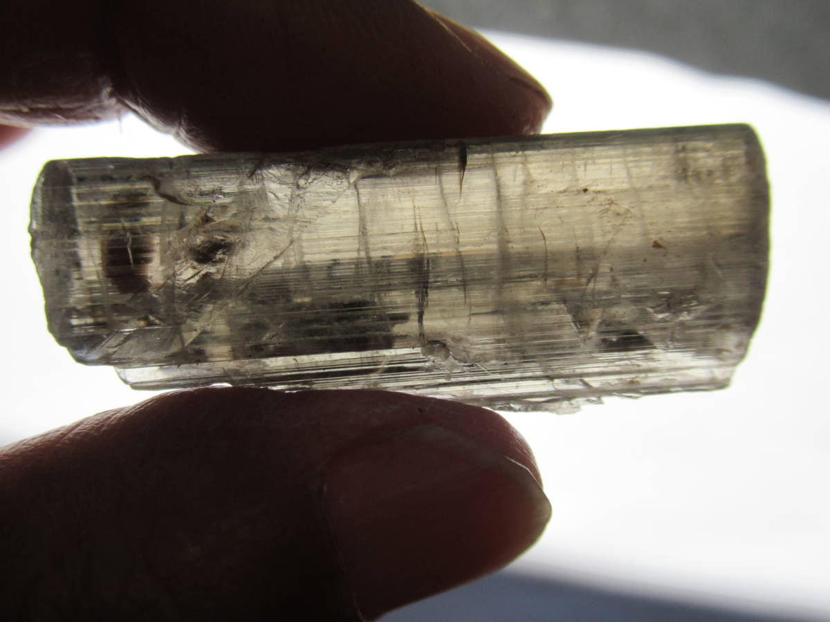 Clinozoisite(斜灰簾石)パキスタンカシミールShaiman Mine near Zagi,Moanlain,Fata,Pakistan。パキスタン産クリノゾイサイトでは黄色系のものが宝石として流通していますが本品は薄いオリーブ色ないし灰緑色で、結晶の端は一方gs平坦で粘土質が付着しもう一方はほぼ平坦ですが細かい結晶面が密集していてその一定方向に反射光が見られますので細い平行連晶だと思われます。柱面は3面に結晶成長のタテ筋が明らかで1面は劈開面。内部は透明度はそこそこですが底面に平行ですが劈開ほど直線的ではい糸くず様の不透明線が十数本見られ、同様な形の浅いヒビが表面近くにまばらに見られます。サイズタテヨコ高さ16/9/42mm、重さ7,8g。送料無料。