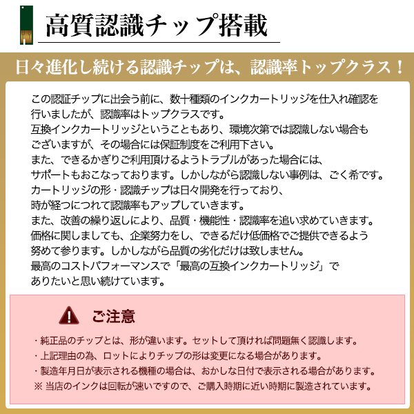 | 特徴 | ICチップ付・残量表示可能(一部機種除く) ※インクランプは点灯しません。 |