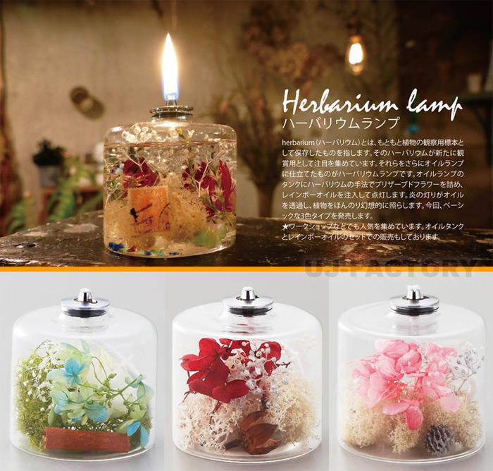 | 【 ここがポイント 】 ★herbarium(ハーバリウム)とは、もともと植物の観察用標本として保存したものを指します。そのハーバリウムが新たに観賞用として注目を集めています。それらをさらにオイルランプに仕立てたものがハーバリウムランプです。オイルランプのタンクにハーバリウムの手法でブリザーブドフラワーを詰め、レインボーオイルを注入して点灯します。炎の灯りがオイルを透過し、植物をほんのり幻想的に照らします。