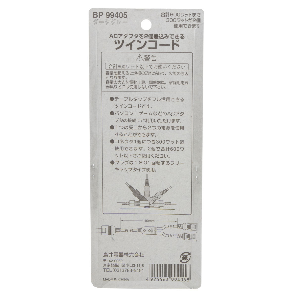 パソコン、ゲームなどのACアダプタの接続にご使用いただけます。一つの受口から2つの電源を使用することができます。コネクタ1つにつき300Wまで、2つの合計で600W以下でご使用ください。水がかかる場所では使用しないでください。コンセントタップ