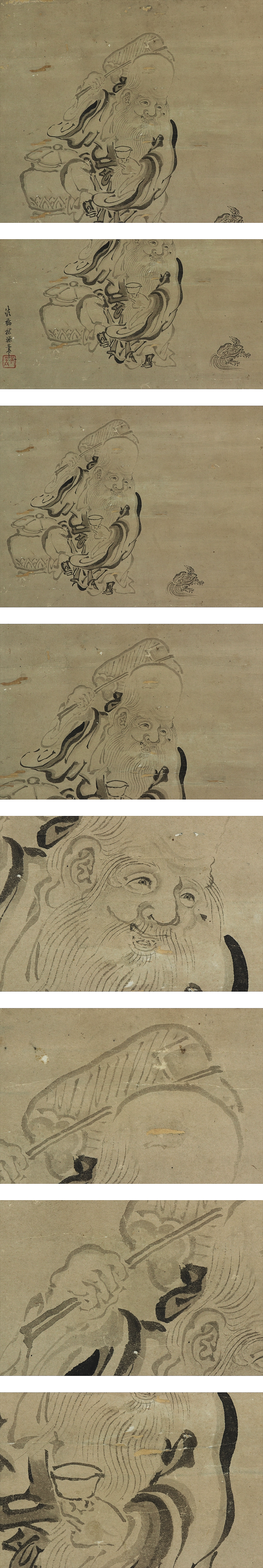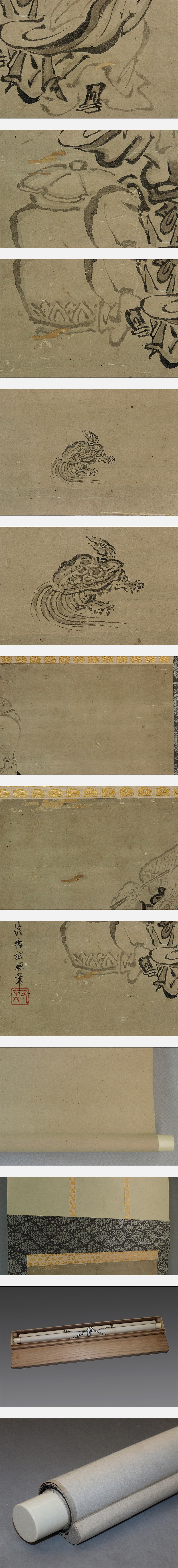 鶴沢探鯨 つるさわ-たんげい (?-1769) 江戸時代中期の画家。狩野(かのう)派鶴沢家2代。 父鶴沢探山の跡をつぎ,禁裏御用絵師をつとめた。法眼(ほうげん)。 明和6年8月21日死去。享年八十余歳。名は守美。作品に旧明眼院障壁画。 本紙は、染み、汚れ、強い折れと皺多い、擦れ、虫食、破れ、ヤケがあります。 表装は、染み、汚れ、折れ、皺、くすみがあります。 【サイズ】 作品 横約50cm×縦約35cm 表装 横約61cm×縦約118cm |