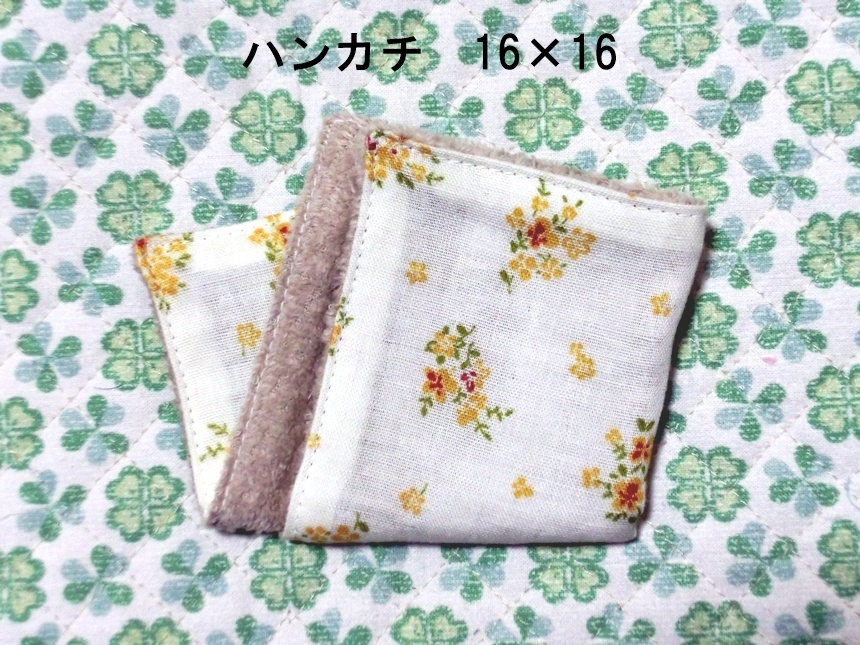 ポケットに収まりやすい、ハンドメイド・正方形16×16センチのダブルガーゼ&タオルのハンカチです。 薄すぎず、厚すぎず、吸水性と速乾性にこだわりました。 型崩れ防止のために、ぐるっと一周ステッチをしてあります。 タオル生地は、肌触りが柔らかく気持ちのいいループをカットしてある国産シャーリングタオル生地を使用しております。 小さなお子様、入園入学にいかがですか? 職業用ミシンで作製しました。 手持ちの生地すべては出品できておりません。 出品中の生地でご希望の生地・ご希望のサイズがありましたら質問よりご連絡ください。 生地の在庫がありましたら、対応させていただきます。(タオル生地の色は画像と同じものになります) 商品名にご依頼者様のオーダーと記載し出品させていただきます。 サイズ:16×16センチ 素 材:ダブルガーゼ&国産シャーリングタオル生地 | ||