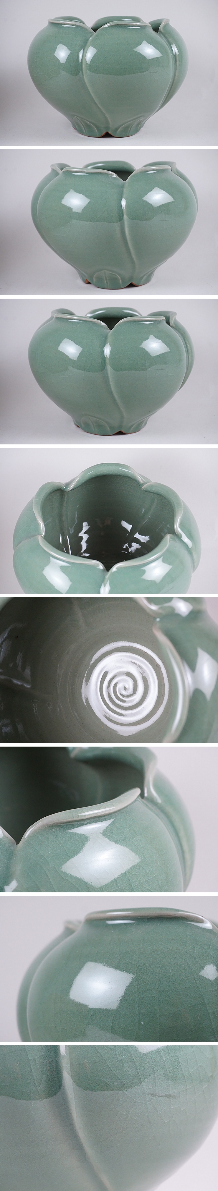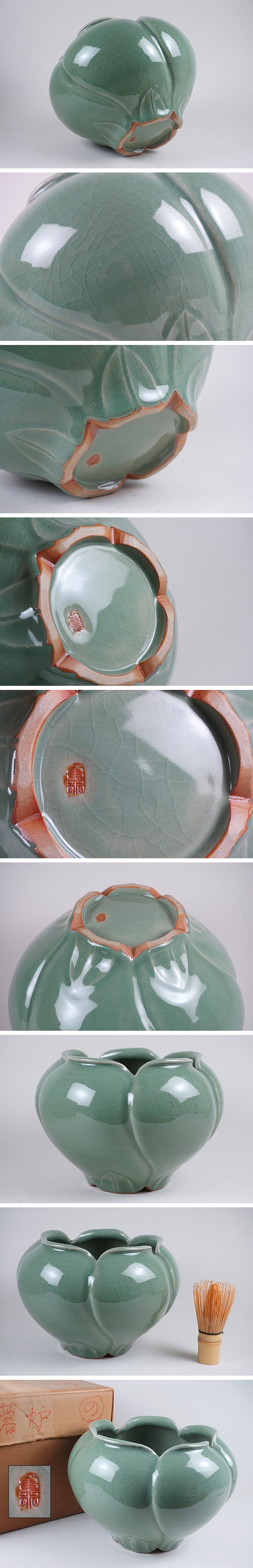 | 青磁の芙蓉型風炉です。 (画像にはありませんが、灰もお付け致します。) 青磁釉の美しい炉です。 小さな擦れのみ、大きな傷はありません。画像ご参考の上ご入札ください。 重さ2,522g 高さ17.0cm 口径18.0cm 身幅24.8cm | |||