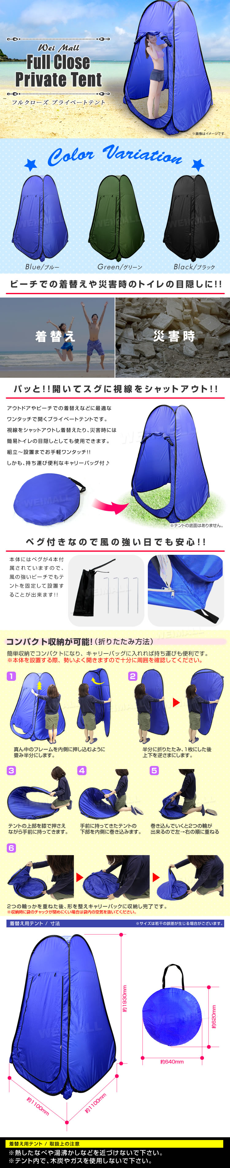 | MERMONT - メルモント - ワンタッチ 着替え用テント (プライベートテント 簡易トイレ) (約)全幅 110 ×全奥 110 ×全高 193cm 扉ジッパー開閉仕様 (外側&内側から扉を開閉できます) カラー:青/ブルー 海水浴やアウトドアでの着替えに! 女性やお子様でも1人で簡単に設営できる どこでも着替えができる着替え用のテントです。 足元のひもを踏んで横倒れ防止できます! キャンプや海や川などに行ったときに、車内での着替えは狭くて辛い! でもこのテントがあればどこでも着替えができるので便利です♪ 中はゆったり広々で大人でも楽に着替えができます! 災害時には中に簡易トイレなどに設置としてトイレとして使うこともできます! アイデア次第で使い方が広がる簡単テントです! |