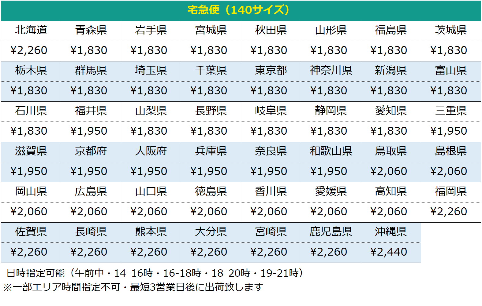 以下配送方法をご案内させて頂きます。 ご落札金額(税込み)+送料の合計をお支払下さい。 ※複数点ご購入の場合、落札数量×都道府県別料金=送料金額となります。 |