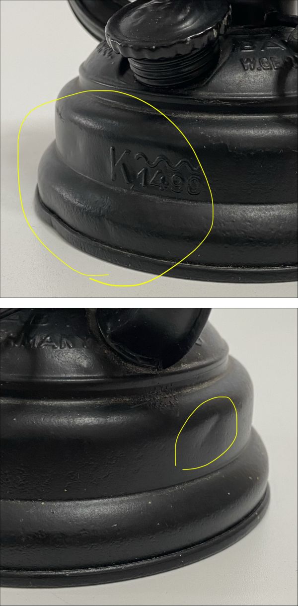 | ご覧いただきありがとうございます。 FEUERHAND フュアーハンド 176STURMKAPPE(STK)DBPa.K1490 stkとはsturmkappeの略称で、風防付きのモデルです。 『DBP』は特許という意味で、『DBPa.』は特許出願中の意味があります。 『DBPa.』は1950年代前半の限られた数年しか製造されていない大変レアな個体です。 K1490の刻印と波線はカールスルーエ波線と呼ばれ、ドイツのカールスルーエ研究所で認定を受けたことを示しており、公共機関での使用が許可された個体です。 176 stkは人気が高いモデルで海外でも高値になっています。状態が良い個体は希少です。さらに『DBPa.』『K1490』の個体はとても希少です。 ホヤは大変希少なAUER社の赤ホヤです。 ホヤはきれいな状態です。 タンク部分に凹み・変形があります(添付写真)。 タンク底面がわずかに膨らんでいるため(1㎜程度)、ランタンを置いたときに若干グラつきます。 シリンダーレバーでホヤを持ち上げた際にレバーの固定が出来ません。 (持ち上げ動作は問題ありませんので支障ないと思います) タンクキャップの脱着が少し固くなっています。 タンクの漏れはありません。 本体高さ 約21cm | ||