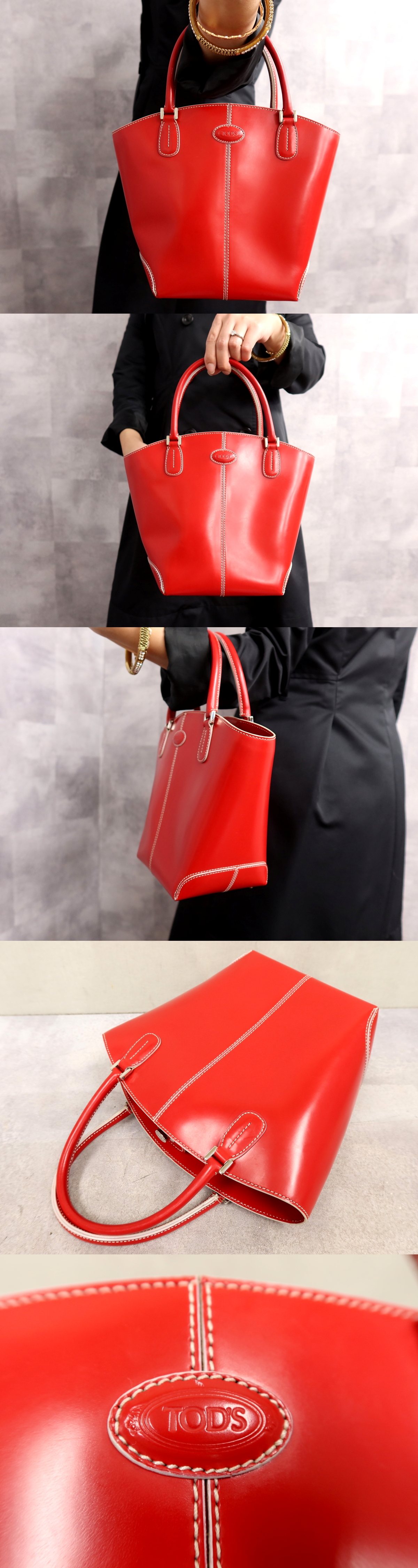 ●超美品●TOD'S トッズ●ロゴ型押し●カーフ レザー 本革●ハンド バッグ●赤●シルバー金具●腕掛け●収納 かばん●Js65222