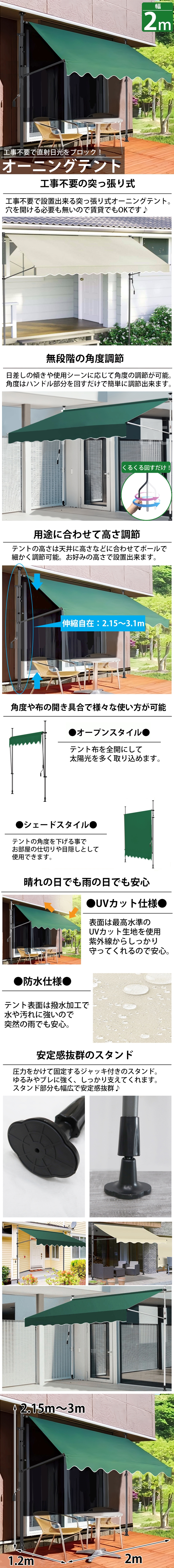 ![]() お庭をオシャレなオープンカフェの様な空間に仕上げてくれる つっぱり式のオーニングテントです。 工事不要のつっぱり棒を用いたオーニングなので ネジ固定のタイプとは異なり、気軽に設置出来ます。 本体の高さも幅広く伸縮できるので、シーンや天井の高さに合わせて 簡単に調節してお使い頂けます。 日の傾きに合わせて自由に角度調整可能で、 スタンド部分のハンドルをくるくる回すだけ無段階で調整可能。 テントの角度を下げればサンシェードの様に目隠しや仕切りに、 全開にすれば太陽光を取り込めるオープンタイプに。 お好みの角度に合わせてお使い下さい! UVカット加工が施された生地なので強い紫外線からしっかりと防いでくれます、 水も弾く撥水加工も施されているので突然の雨でも安心。 汚れにも強いので長くお使い頂けます。 スタンド部分は圧力をかけてしっかり固定できるジャッキ式スタンドなので ゆるみやブレ、滑りに強い安心設計です。 ※簡易外国語説明書付き 商品詳細 サイズ(約):高さ2.15~3m×幅3m×奥行き1.2m 材質 ・テント部分:ポリエステル(撥水加工) スタンド部分:アイアン ・カラー:グリーン |