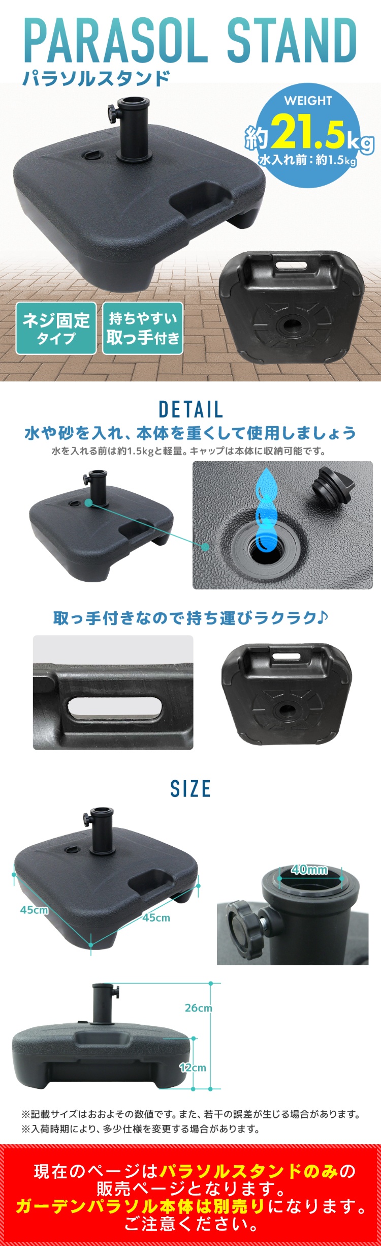 | パラソルベース 21kg 中に水を入れて使用するパラソルベーススタンド。 ガーデンやベランダでのパラソルの使用でオススメ! 使用後は中の水を抜けば軽くなるので持ち運びにも便利です。 本体は取っ手付きなので持ち運びがラクラク! ポール受けキャップは本体に収納できます。 パラソルスタンド以外にも、のぼり等のスタンドに最適! |