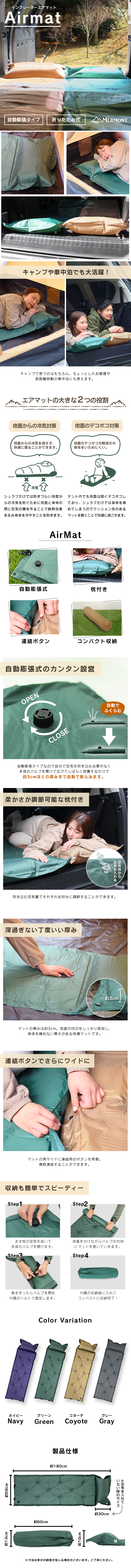 | インフレーターマット ただのエアーマットではありません!! マット上部のバルブを開けば、それだけでマットが自動で膨らむので簡単に設置することができます。 厚さは3cmもあるため快適性は抜群で軽量です。枕もついています♪ 連結可能だから、2点以上購入がオススメ! 収納袋、収納バンドがついてくるから、簡単にコンパクトできます。 アウトドア・キャンプでの使用にはもちろん、ツーリング、車中宿泊などさまざまなシーンでご利用いただけます。 軽量・コンパクトなので地震や災害時の防災用品としてもオススメです |