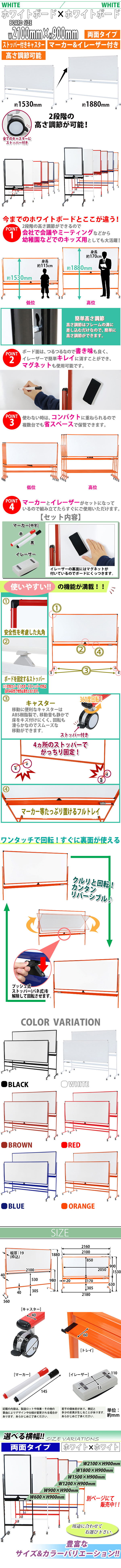 | 商品紹介 | ●大切なメモや伝言をサッと書き残す事が出来る回転式両面ホワイトボードです。 ●簡単に消す事も出来、二枚分のホワイトボードの使い分けも出来るので大変便利です。 ●マーカーとイレーザー付きなので組み立てればすぐにご使用いただけます。 ●フルトレイは、約2kgの耐荷重があるのでイレーザーやマーカー等の収納にも困りません。 ●会議や塾等様々な用途に合わせてご使用いただけます。 ●高さ調節ができるので会社での会議や打ち合わせなどから幼稚園などでのキッズ用まで幅広く使えます。 ●全てのキャスター(4ヵ所)にストッパー付きなので、がっちりキャスターを固定して、ホワイトボードのぐらつきを防ぎます。 ●キャスターの材質はABS樹脂製で、移動音も静かで床をキズ付けにくく、回転も滑らかのでスムーズな移動ができます。 ●使わない時は、コンパクトに重ねられるので複数台でも省スペースで保管することができます。 ※こちらの商品は、組立て式です。 ※ホワイトボードには、ホワイトボード用のペンをご使用下さい。 ●重量:約18kg ●材質:アルミ(ボード枠、トレイ)、スチール(フレーム)、ABS樹脂(ボード固定ストッパー、キャスター、マーカー)、ポリプロピレン(イレーザー) ●付属品:組立説明書、工具(14mmスパナ、4mm六角レンチ付きL字ドライバー) フレームカラーはホワイトとなります。 ★1階車上でのお渡しとなります。恐れ入りますが荷降ろし・搬入は、お客様にてお願い致します。 ●新品商品ではありますが、輸入商品の為、多少の擦り傷などがある場合がございますので、ご納得の上ご購入下さいませ。 ●ご購入後、お客様ご都合によるご返品、ご返金等は一切お受け致しておりません。 ●本商品を使用した際に発生したトラブル、事故につきまして、当社は一切の責任を負いません。ご使用に関しましては、全て自己責任にてお願い致します。 |
