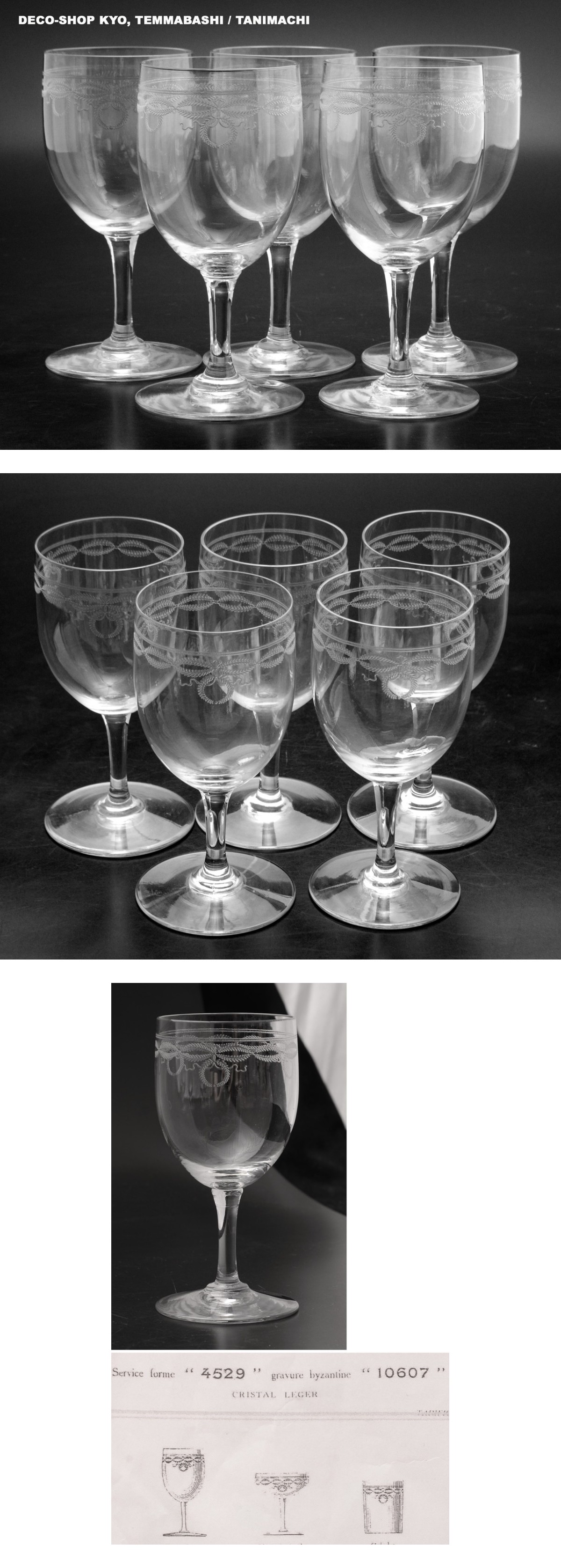 フランスのクリスタル製作の最高峰であるバカラの、アールヌーヴォー期の名パターンとされるビザンティン・Byzantineと称された華やかなグラビュール装飾と、同時代の流麗な造形であるフォーム4529造形の、現存では入手が困難なワイングラスの5点セットです。