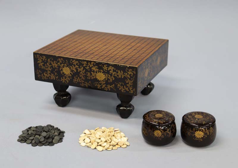 碁盤は側面に菊唐草の蒔絵が施されています。